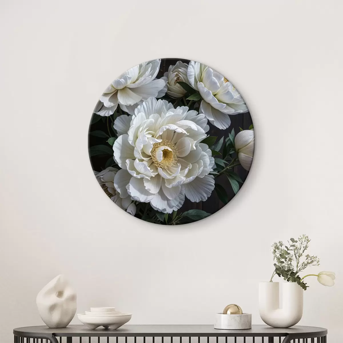 Picturi rotunde Flori albe de bujor cu centre galbene care înfloresc în grădină pe un fundal întunecat Nr r40600