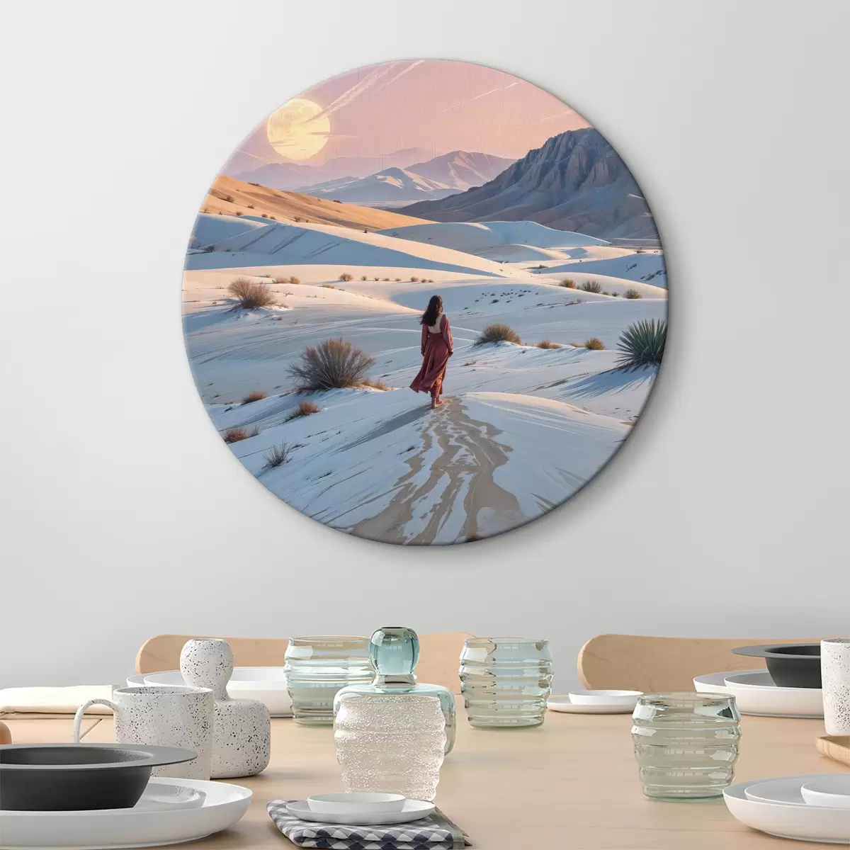 Picturi rotunde Femeie într-o rochie roșie într-un peisaj deșertic cu un munte în fundal și dune Nr r40603