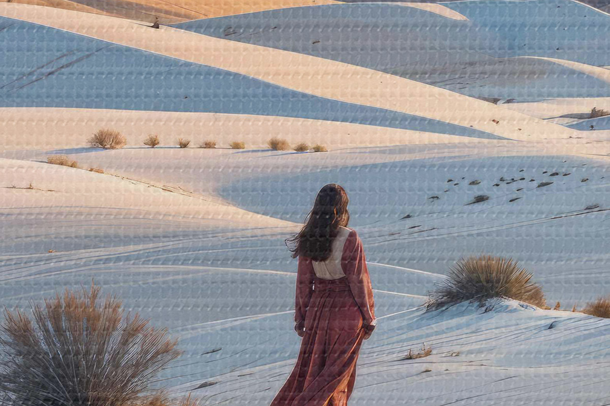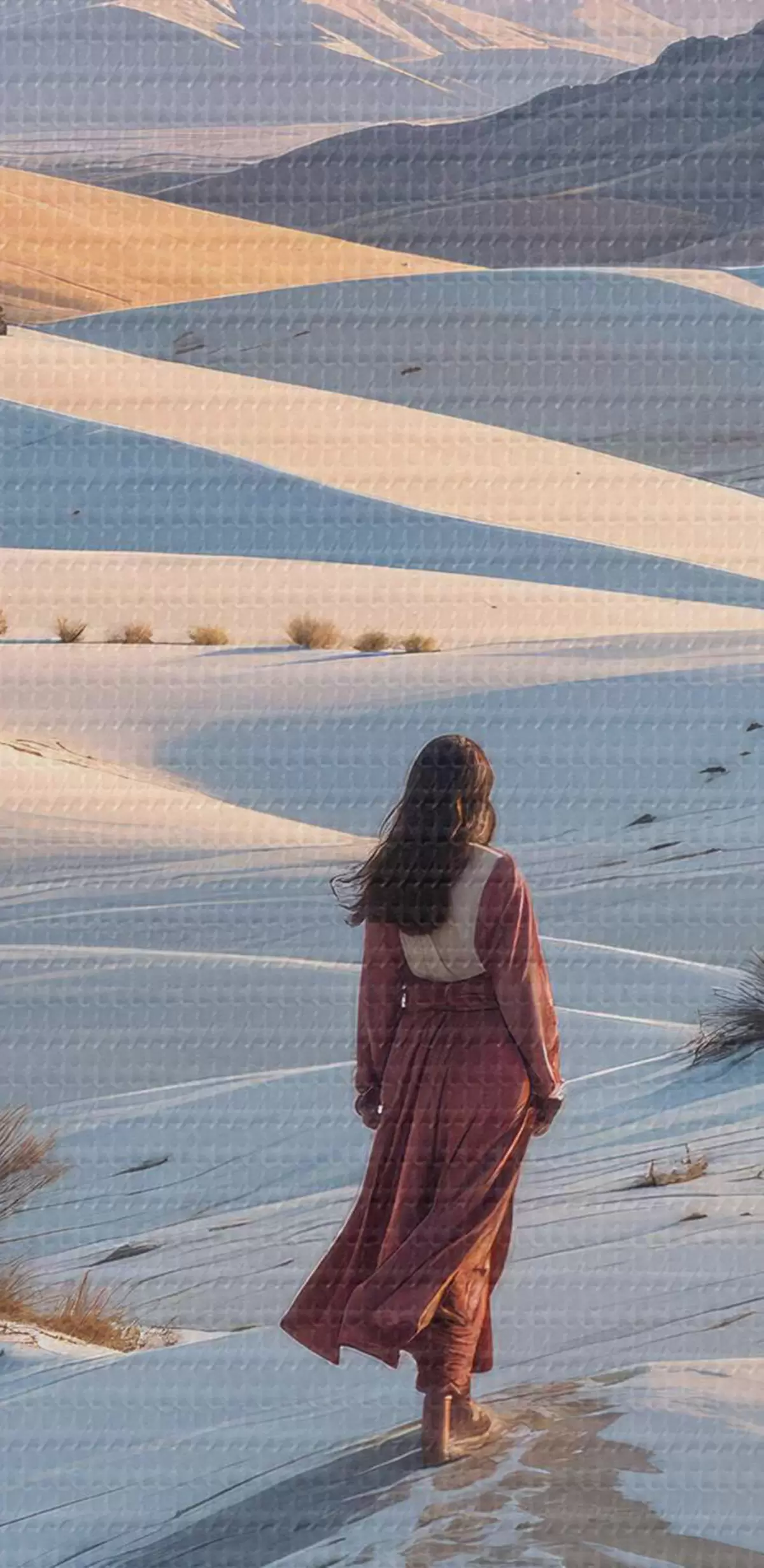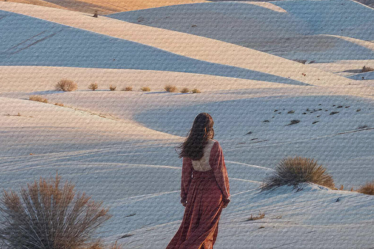 Picturi rotunde Femeie într-o rochie roșie într-un peisaj deșertic cu un munte în fundal și dune r40603