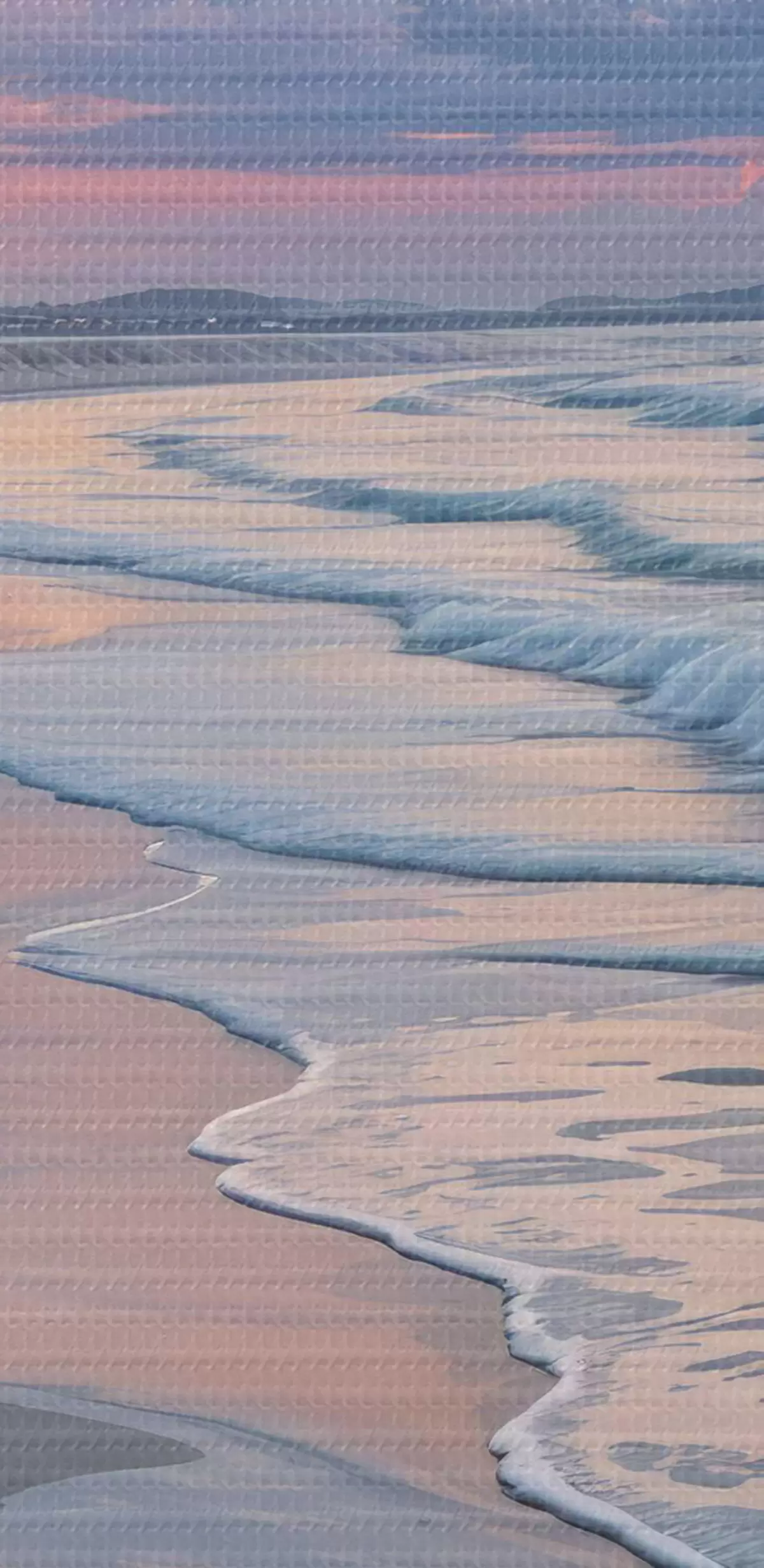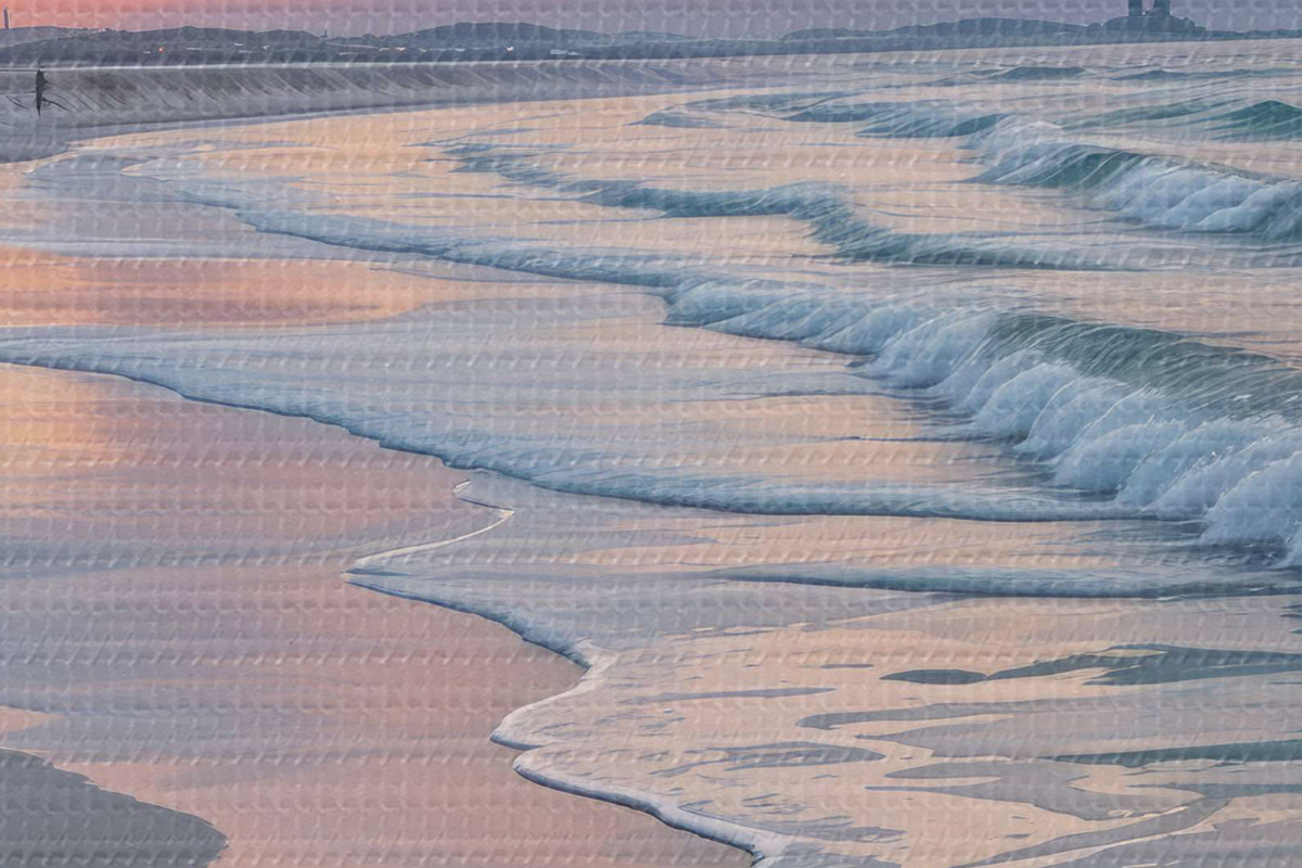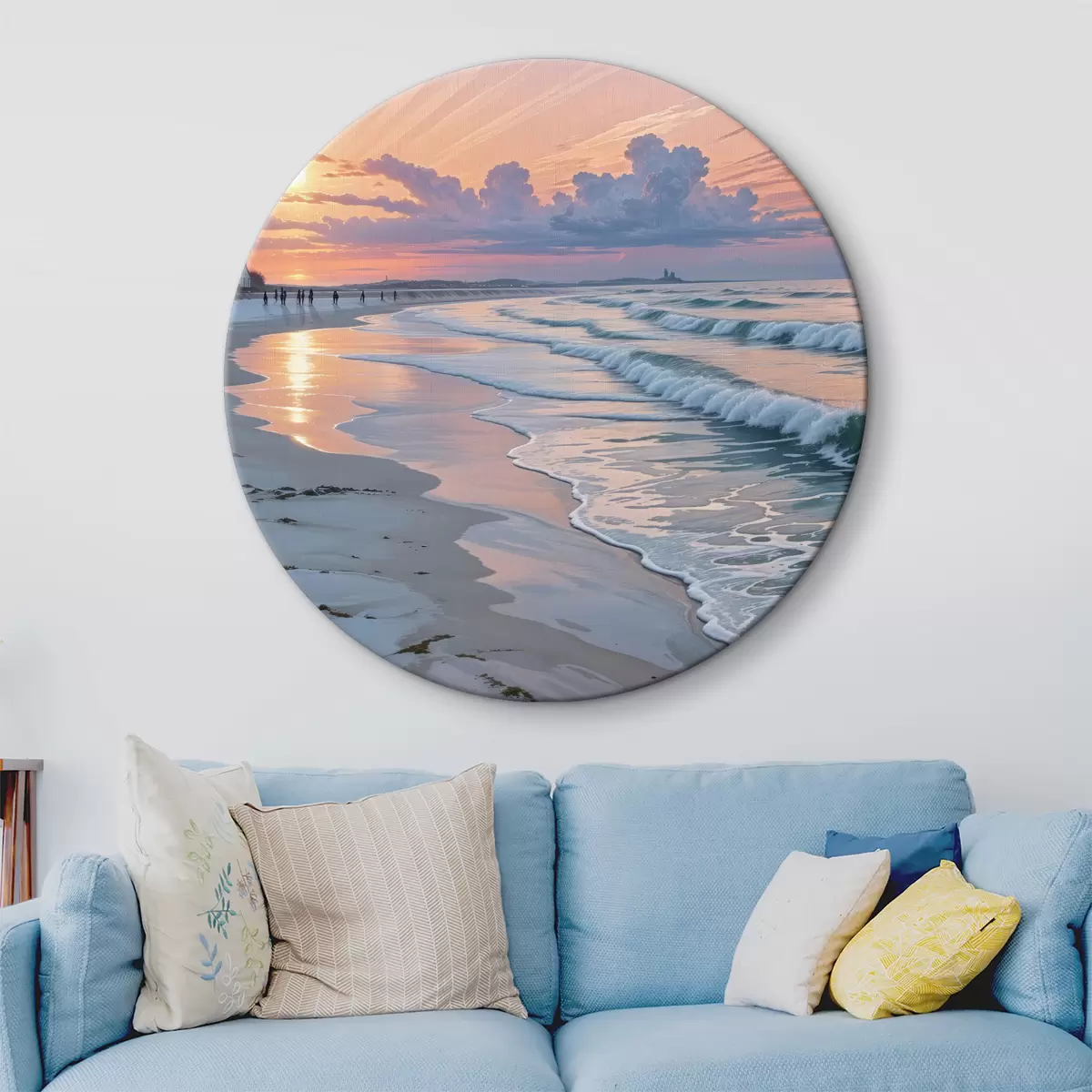 Picturi rotunde Scenă liniștită pe plajă la apus de soare, cu valuri blânde pe țărmul nisipos r40606