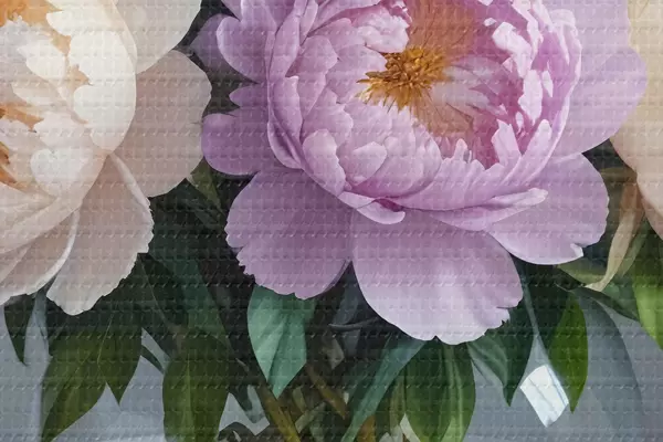 Picturi rotunde Un buchet de bujori mari, albe și roz într-o vază de sticlă pe un fundal gri Nr r40610