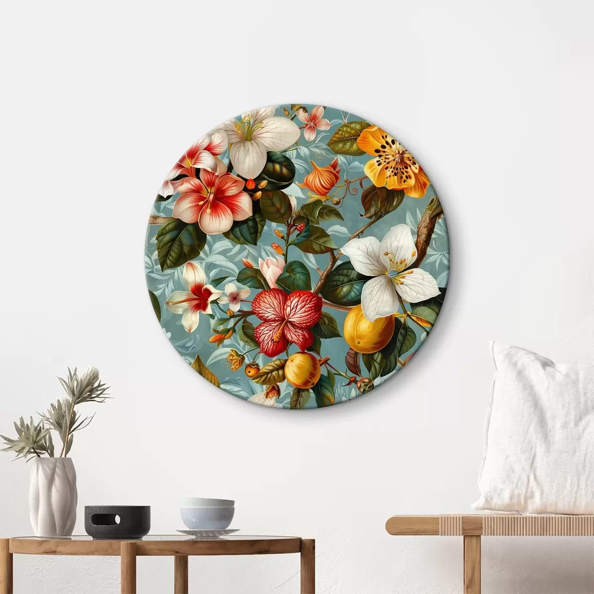 Picturi rotunde Compoziție cu diferite verdeață și flori tropicale pe un fundal albastru Nr r40668