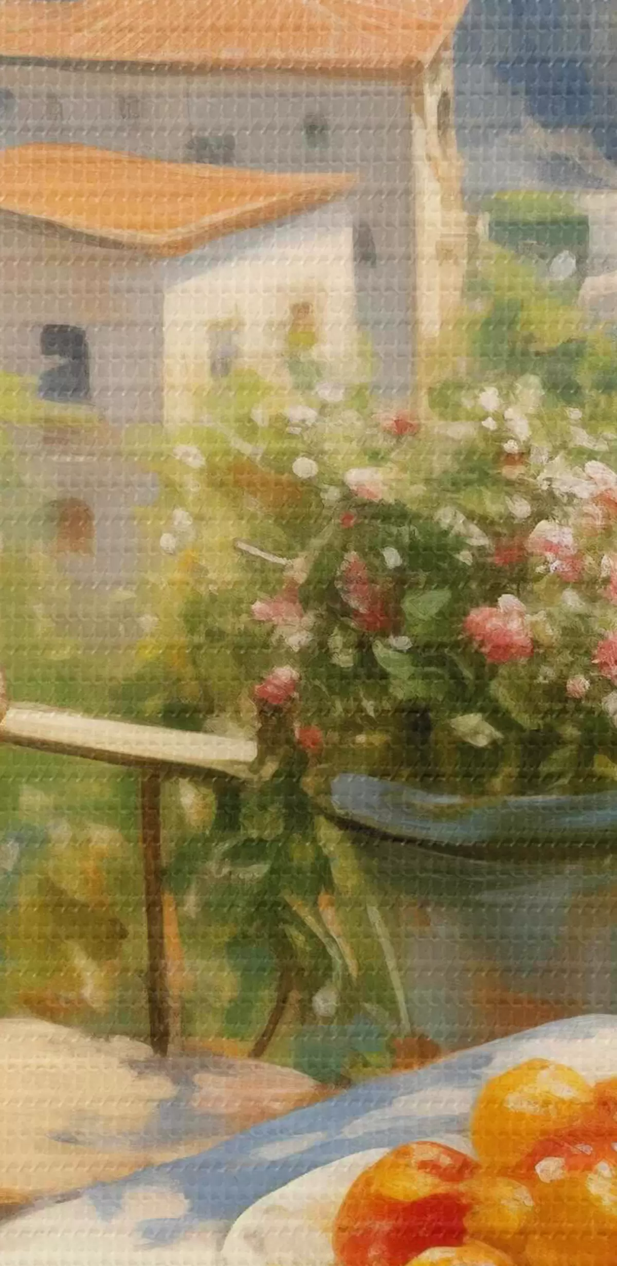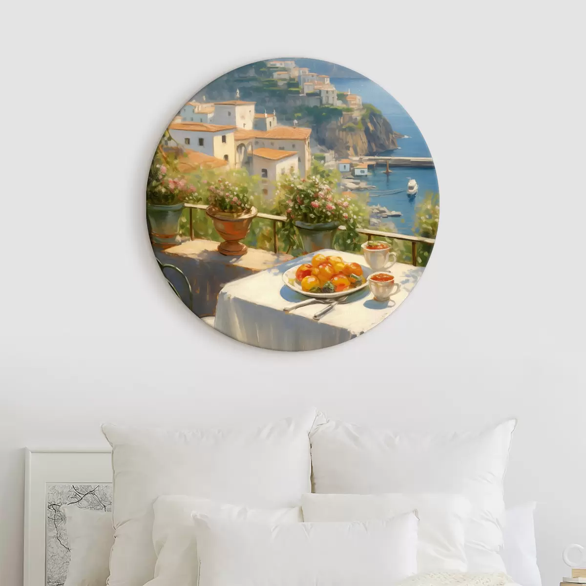 Picturi rotunde Portocale într-o farfurie pe o masă cu vedere la mare și la oraș Nr r40719