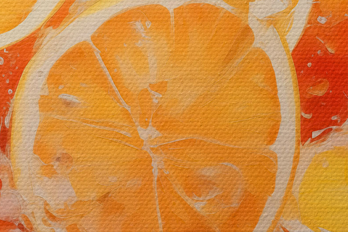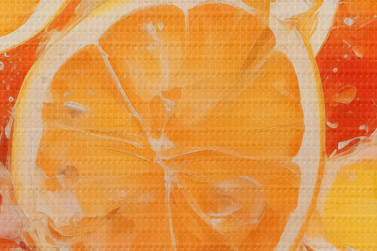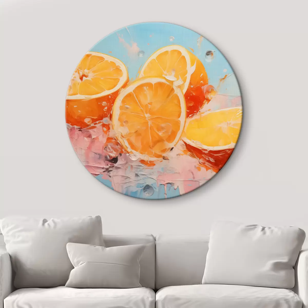 Picturi rotunde Jumătăți de portocale pe masă, portocaliu, roșu, albastru, roz, galben Nr r40727