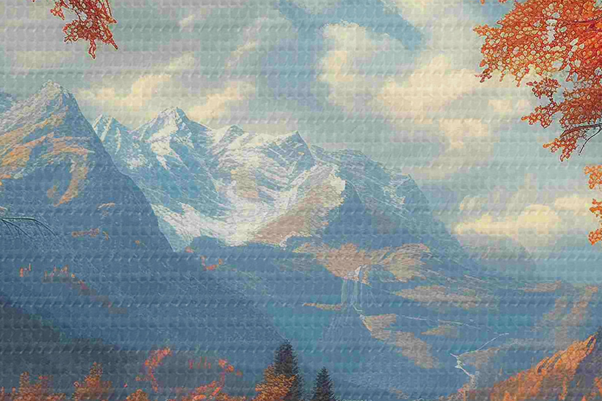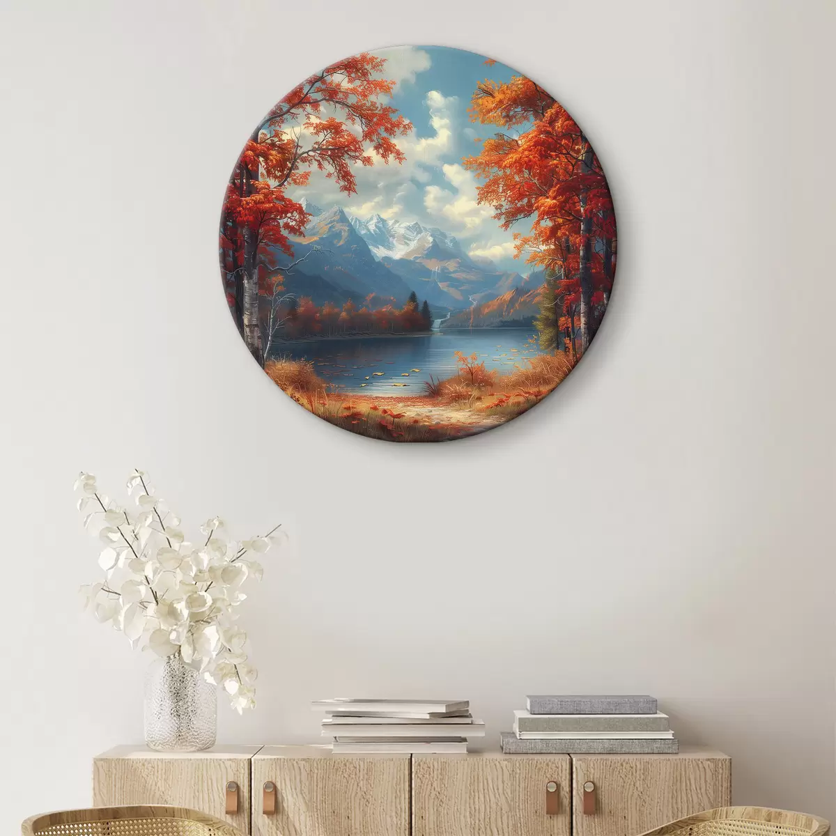 Picturi rotunde Peisaj de toamnă pe fundal de munți lângă iaz Nr r40903