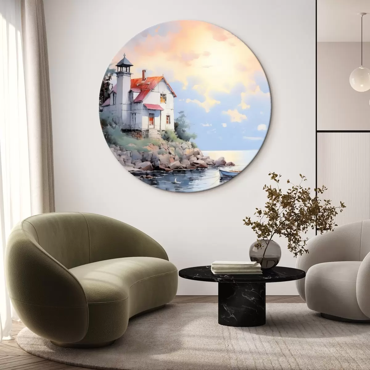 Picturi rotunde Casă pe plajă lângă mare la apus r41010