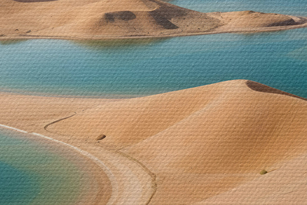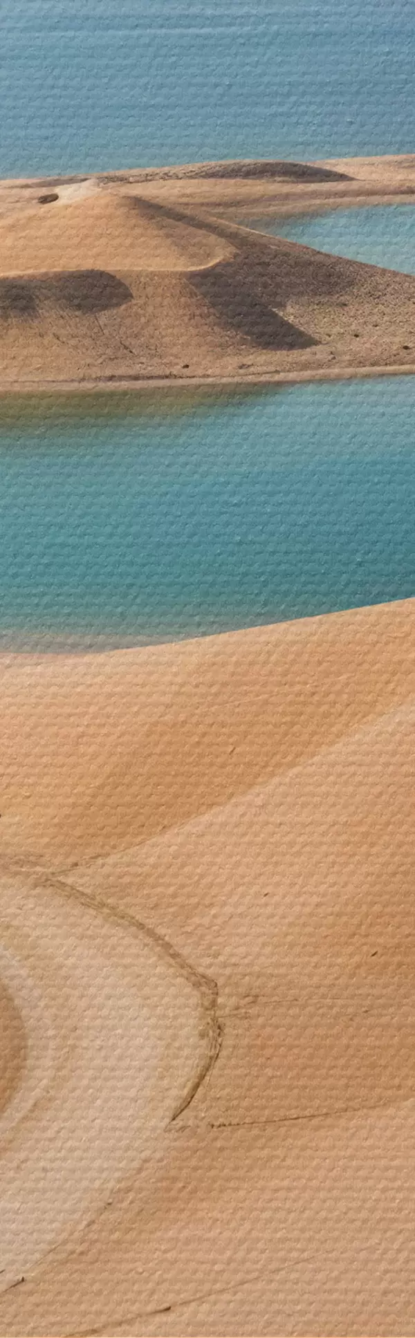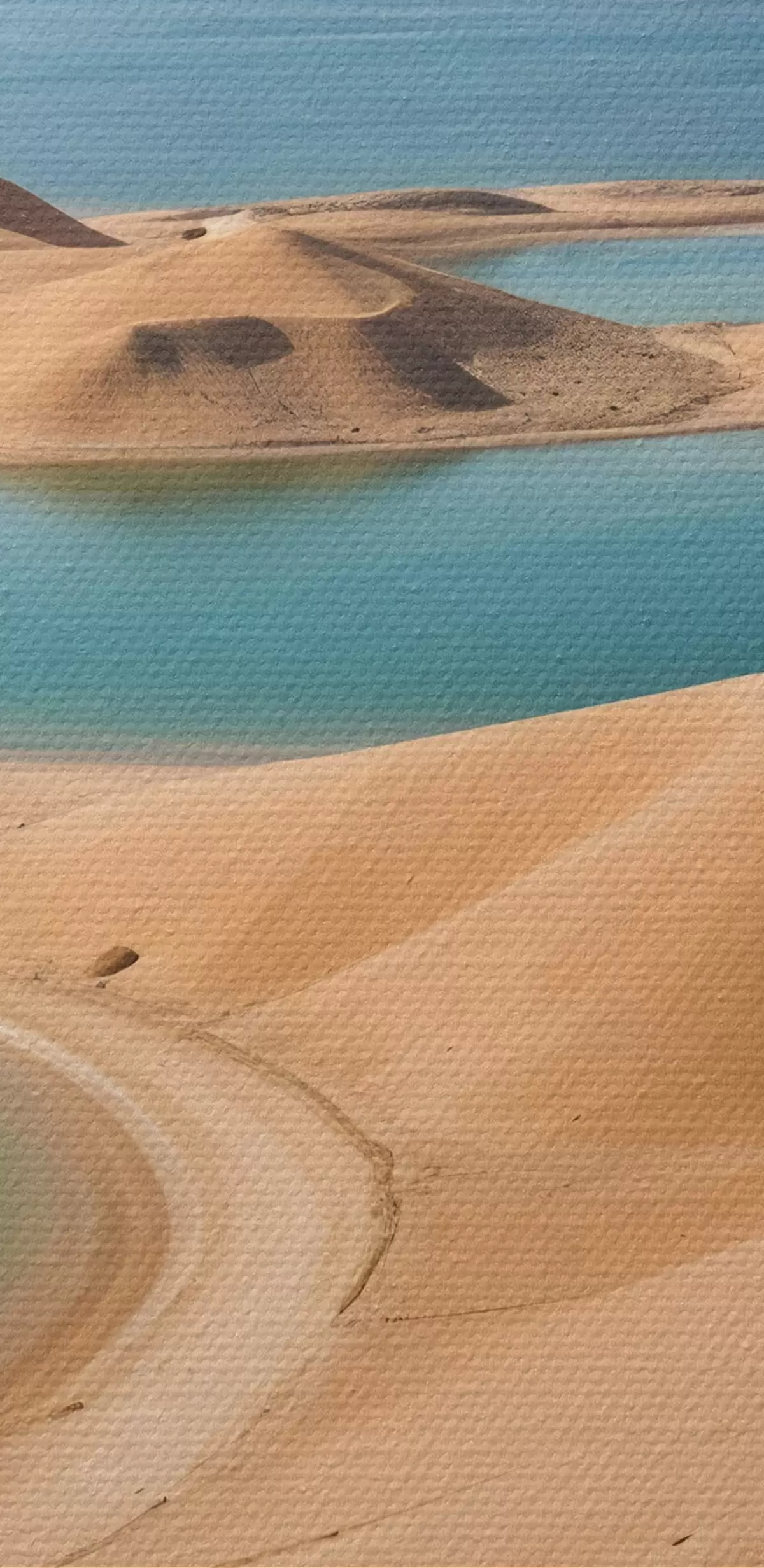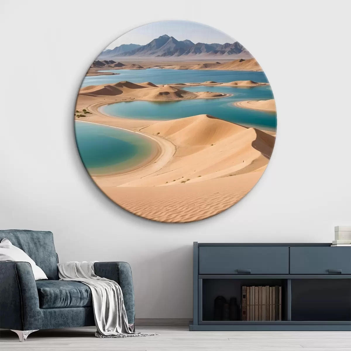 Picturi rotunde Un vast peisaj deșertic cu dune ondulate și lacuri turcoaz, înconjurat de munți accidentați Nr r41087