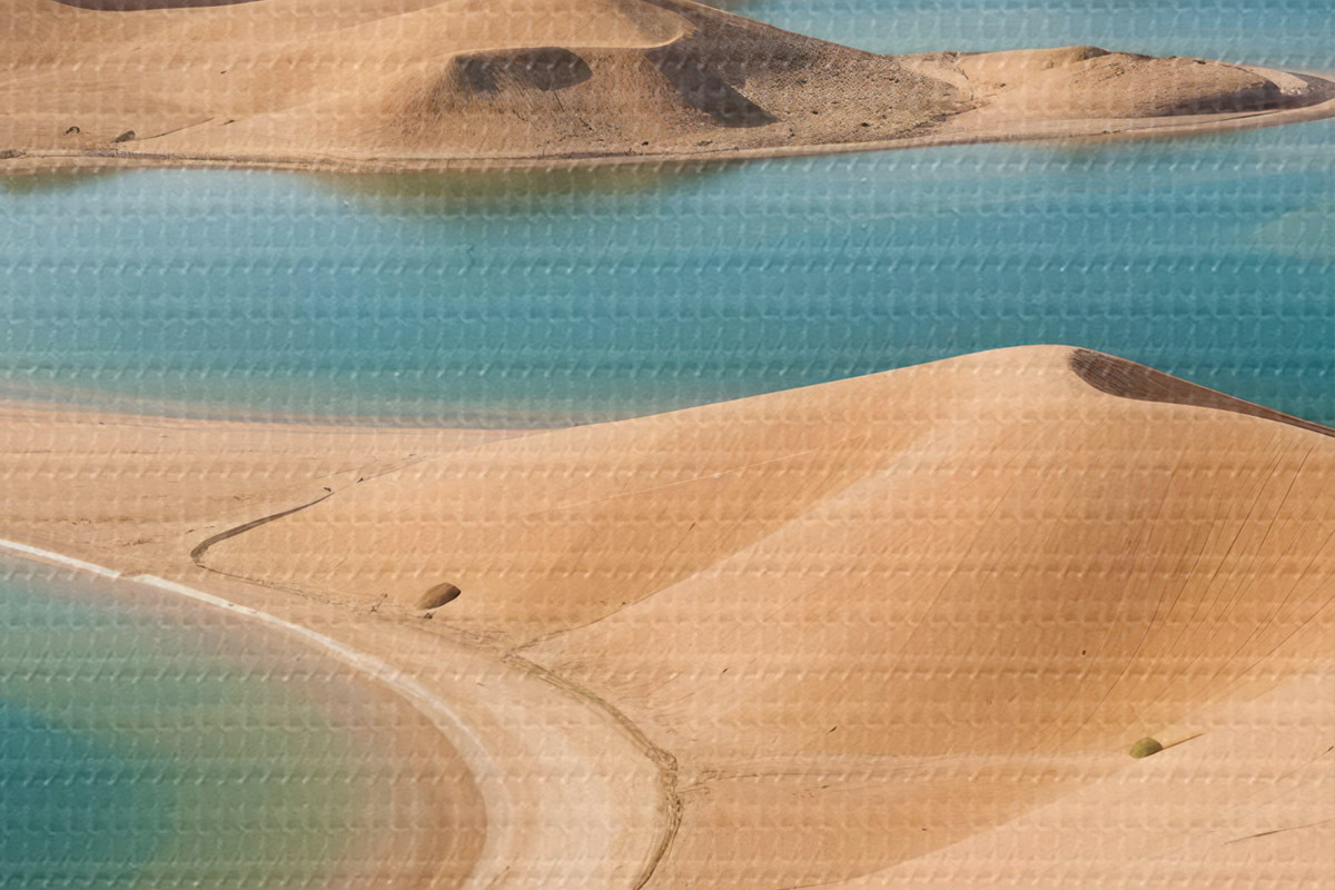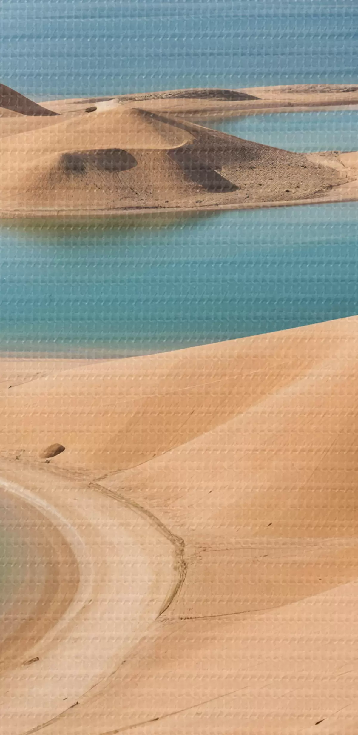Picturi rotunde Un vast peisaj deșertic cu dune ondulate și lacuri turcoaz, înconjurat de munți accidentați r41087