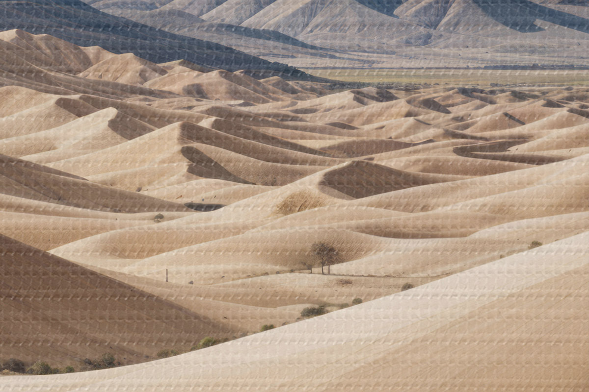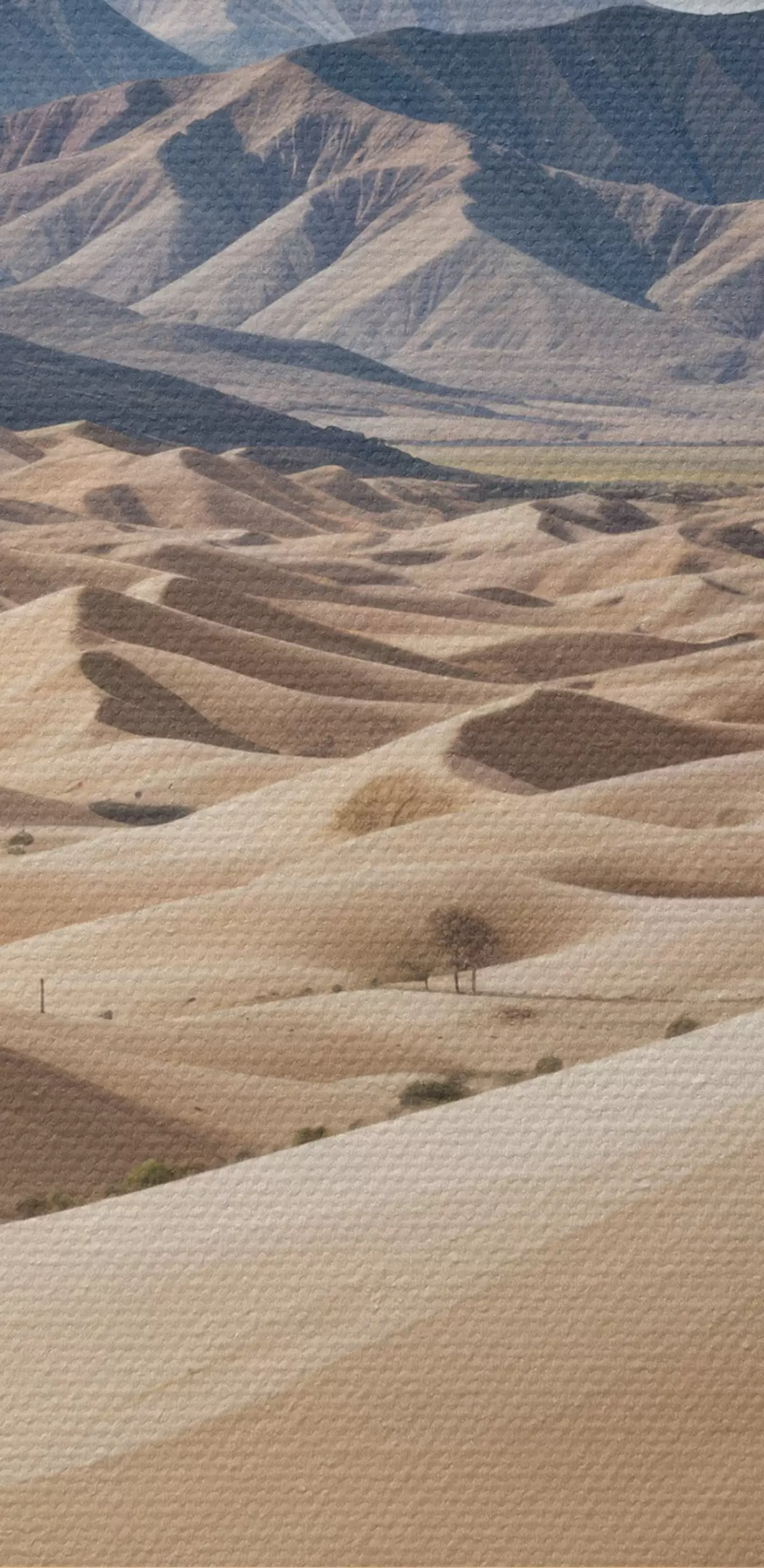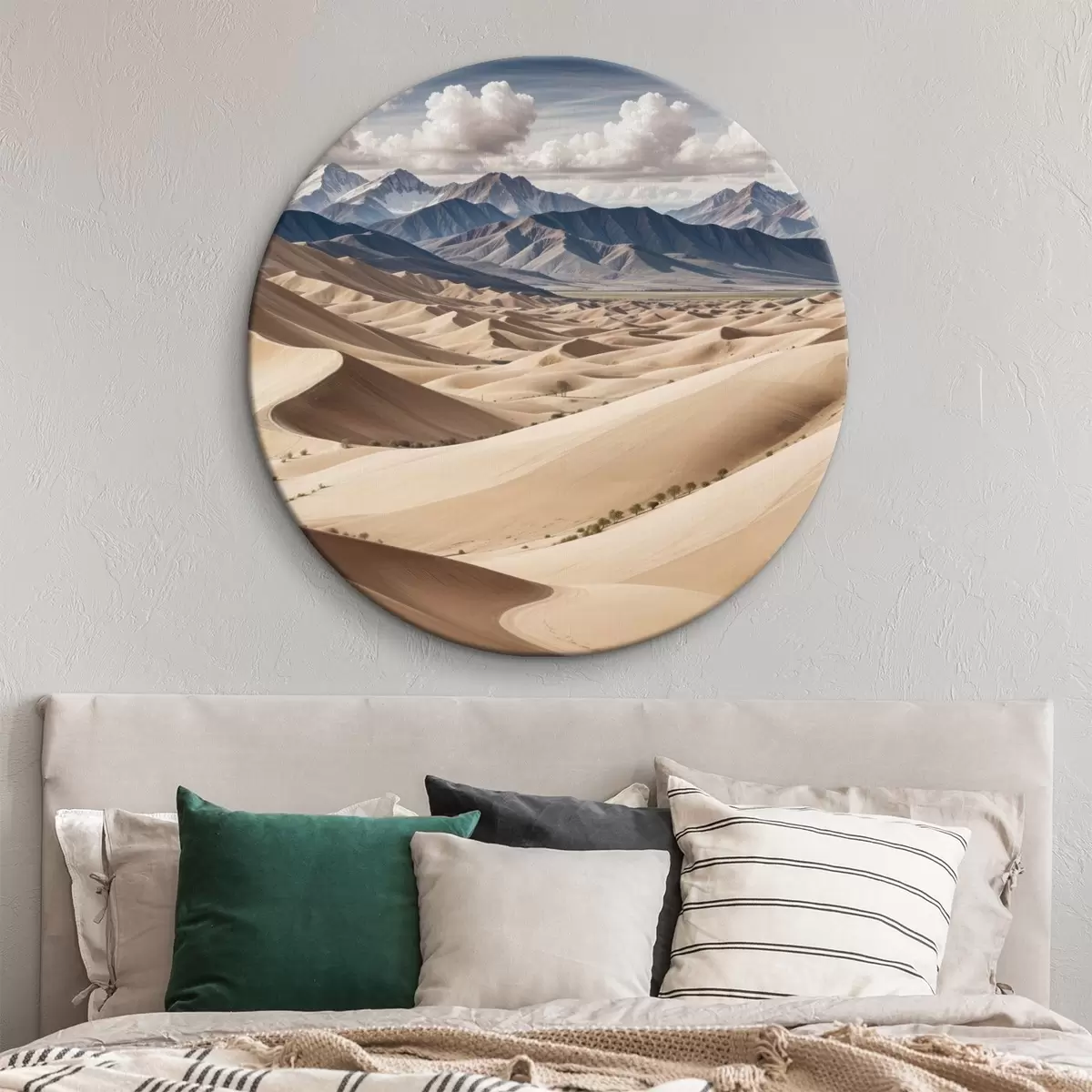 Picturi rotunde Un vast peisaj deșertic cu dune ondulate, munți accidentați în depărtare și un cer înnorat dramatic Nr r41089