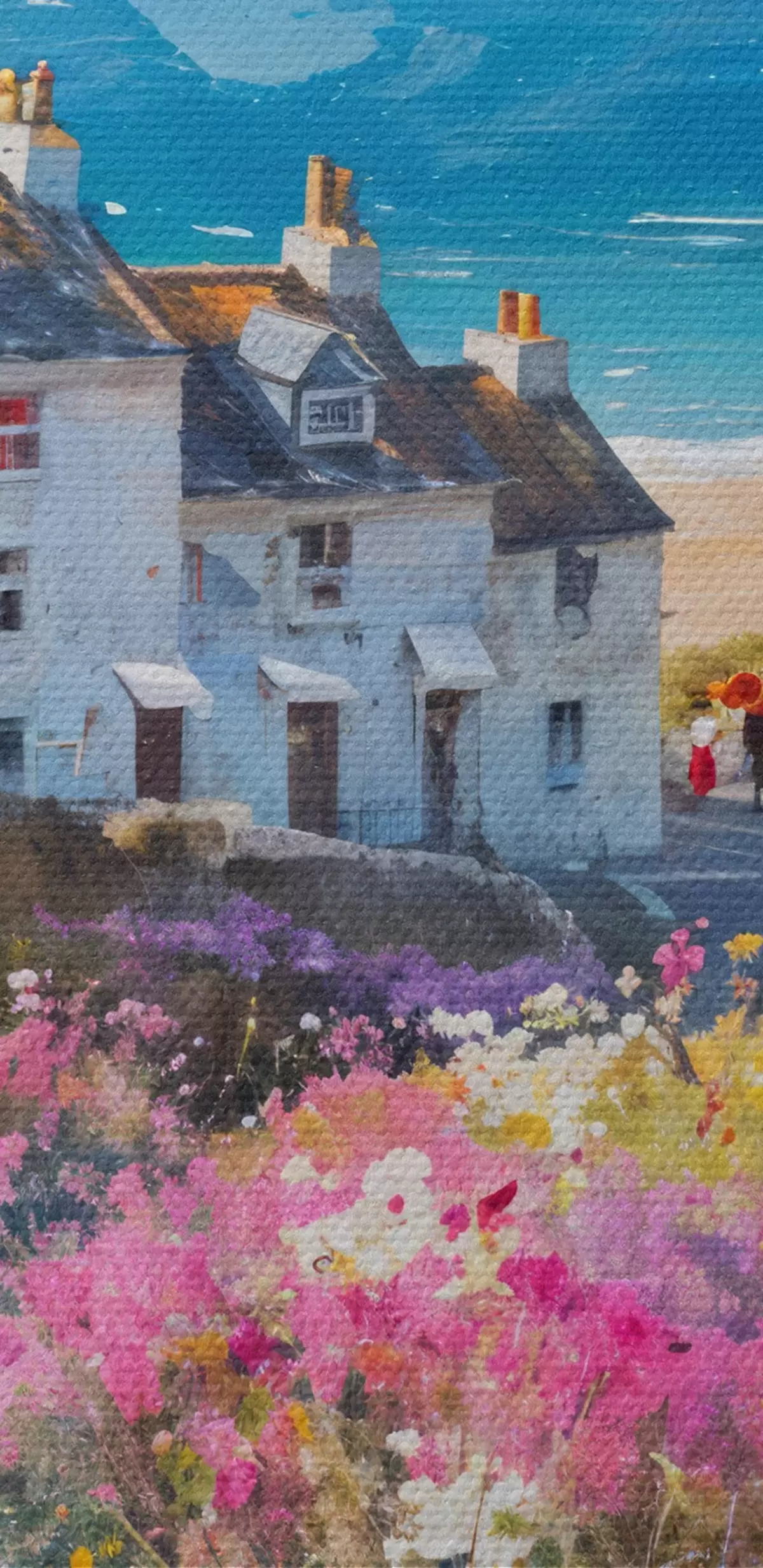 Picturi rotunde O pictură în ulei colorată care descrie un oraș de pe malul mării cu case albe și o grădină de flori vibrante în prim-plan r41090