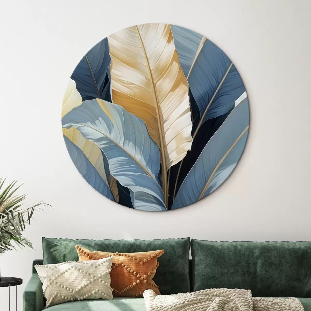 Picturi rotunde Frunze tropicale cu nuanțe de albastru și galben, frunze mari de palmier sau banane cu fundal natural luxuriant Nr r41097