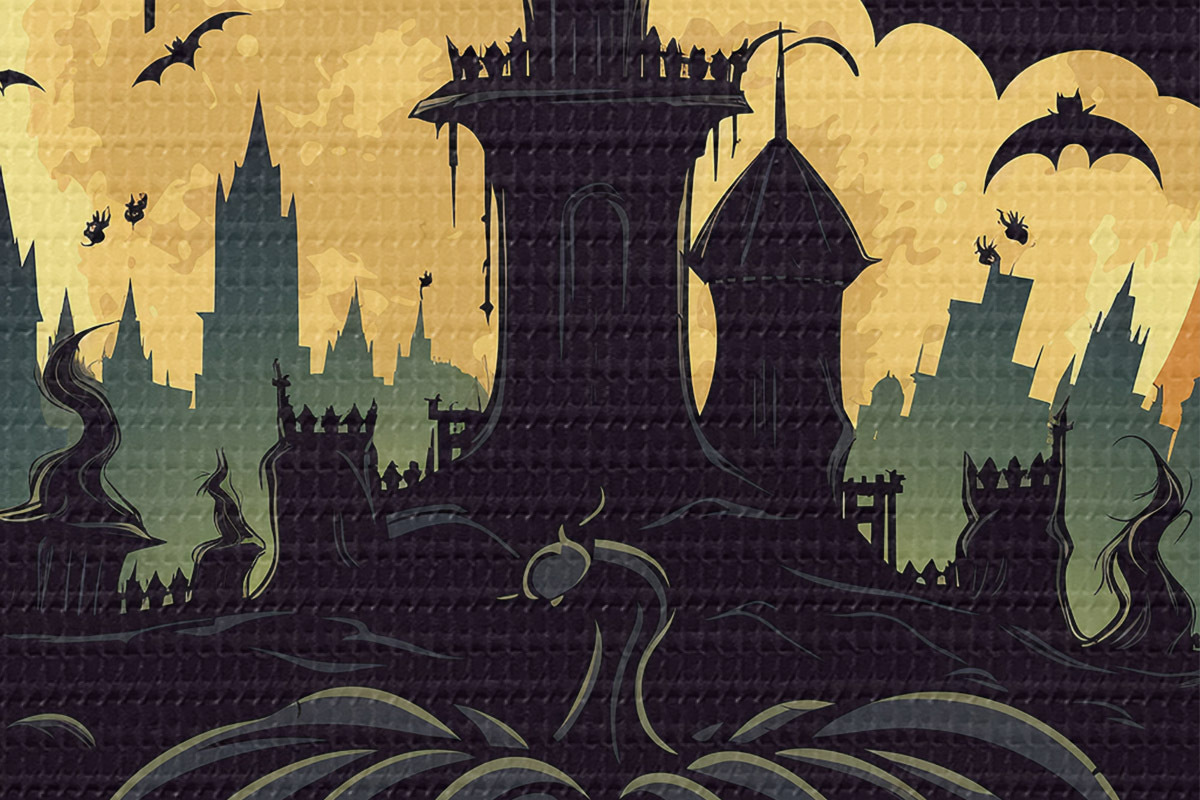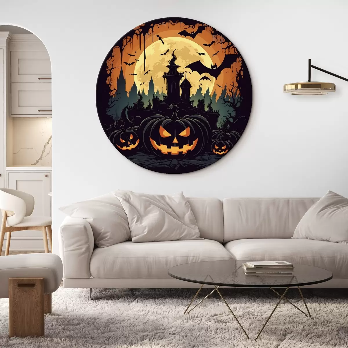 Picturi rotunde Halloween, castel pe fundalul lunii pline, lilieci și dovleci r41138