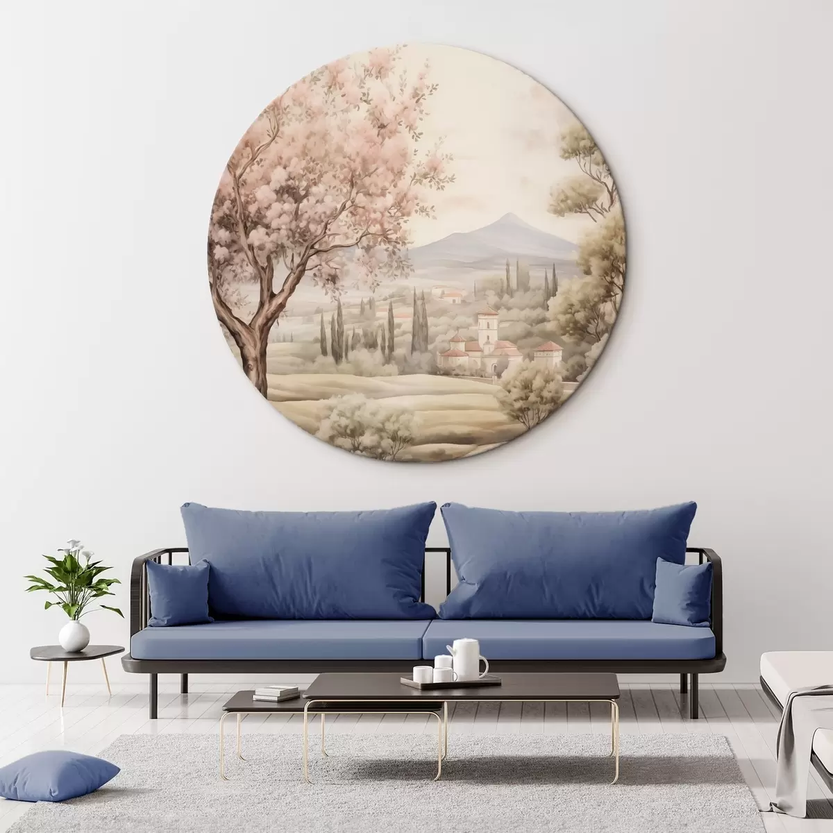 Picturi rotunde Acuarelă dealuri, flori de cireș, castel, stil rustic r41225