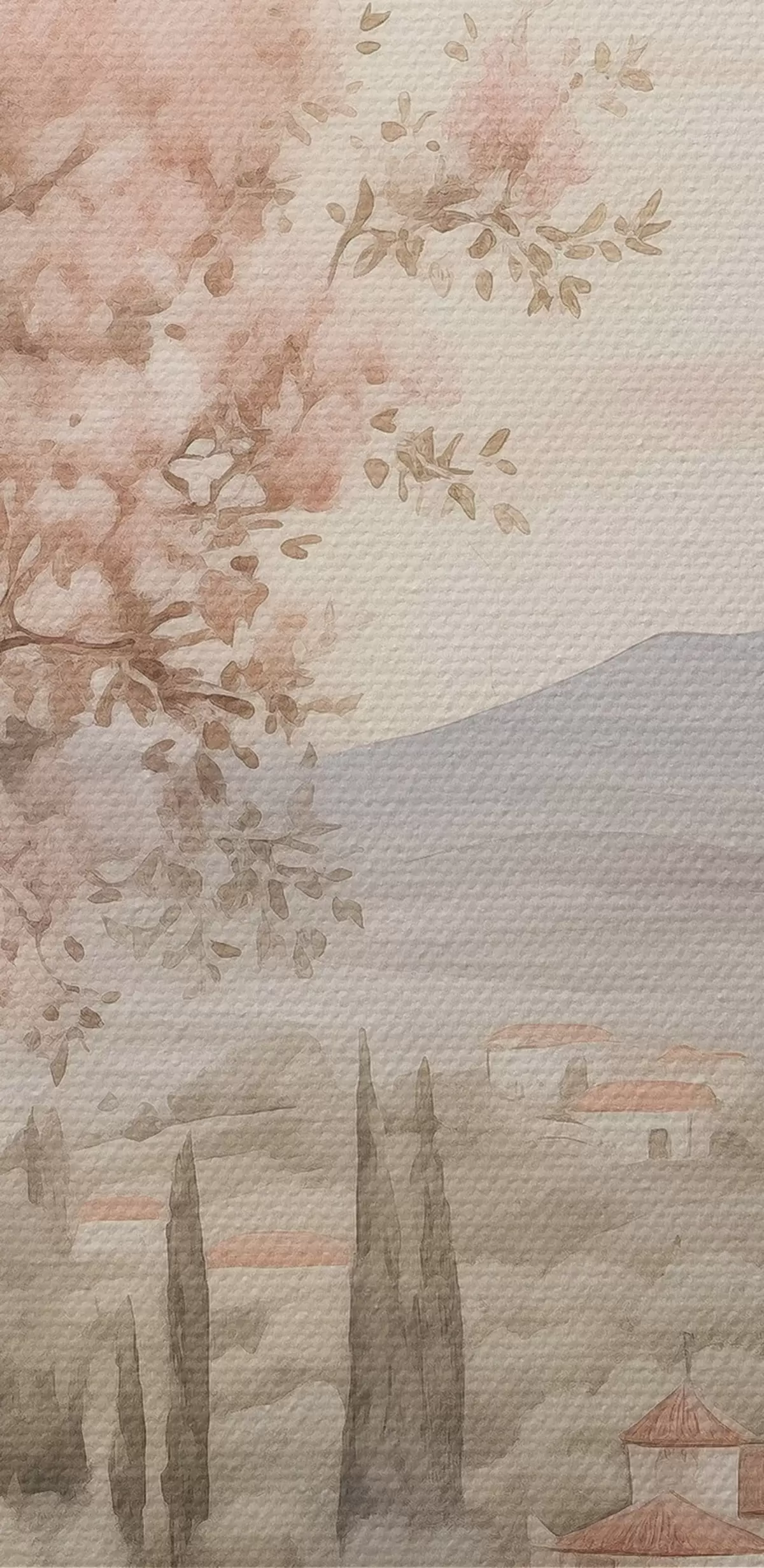 Picturi rotunde Acuarelă dealuri, flori de cireș, castel, stil rustic Nr r41225