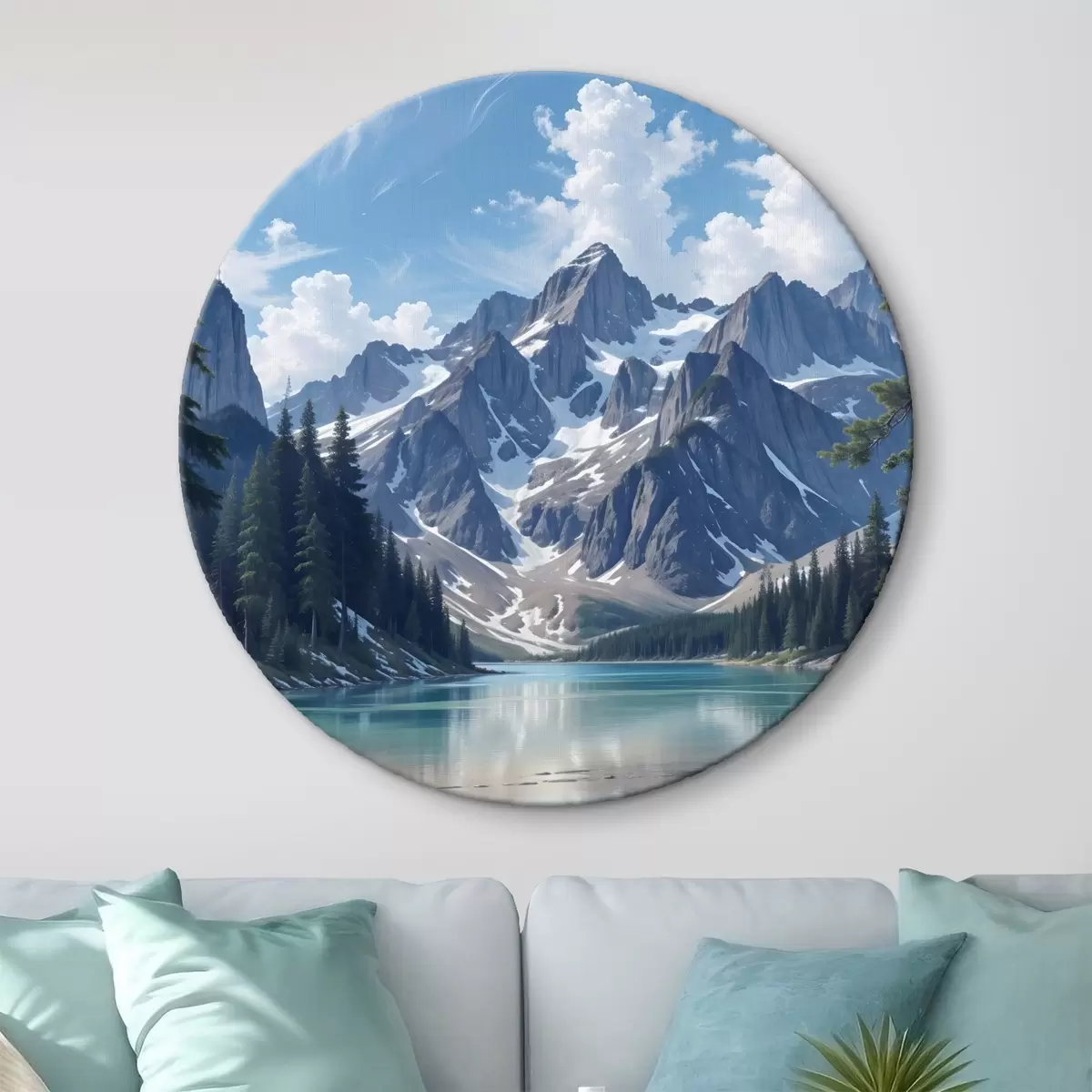 Picturi rotunde Un lac alpin liniștit înconjurat de munți maiestuoși acoperiți de zăpadă, cu o pădure densă și un cer înnorat Nr r41264