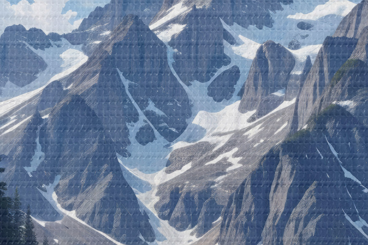 Picturi rotunde Un lac alpin liniștit înconjurat de munți maiestuoși acoperiți de zăpadă, cu o pădure densă și un cer înnorat r41264