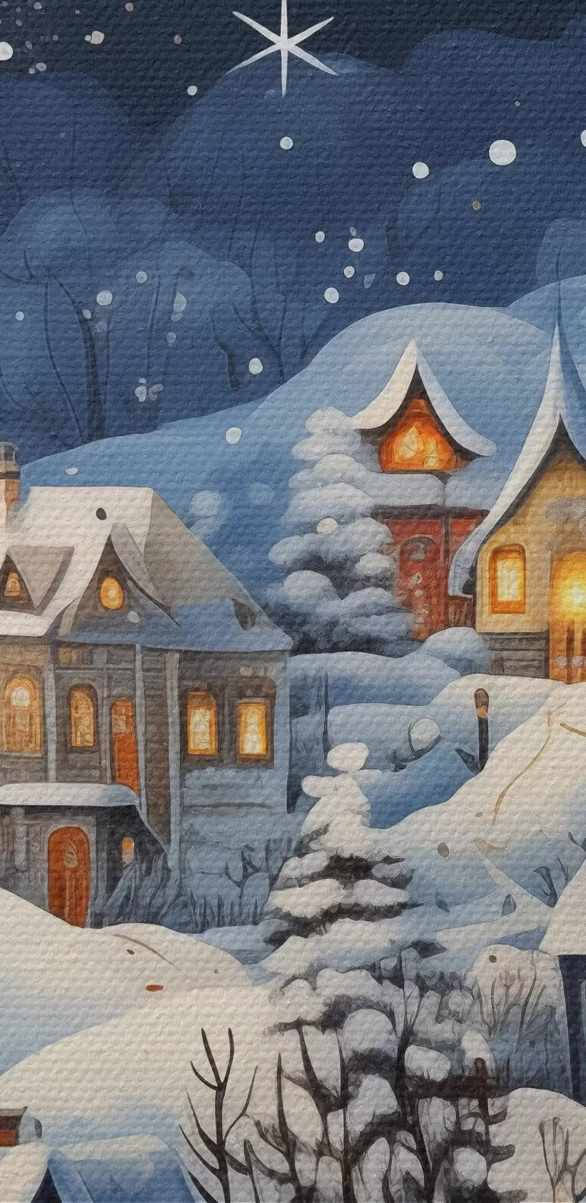 Picturi rotunde Peisaj de iarnă cu case de țară acoperite de zăpadă pe fundalul cerului înstelat de noapte Nr r41275