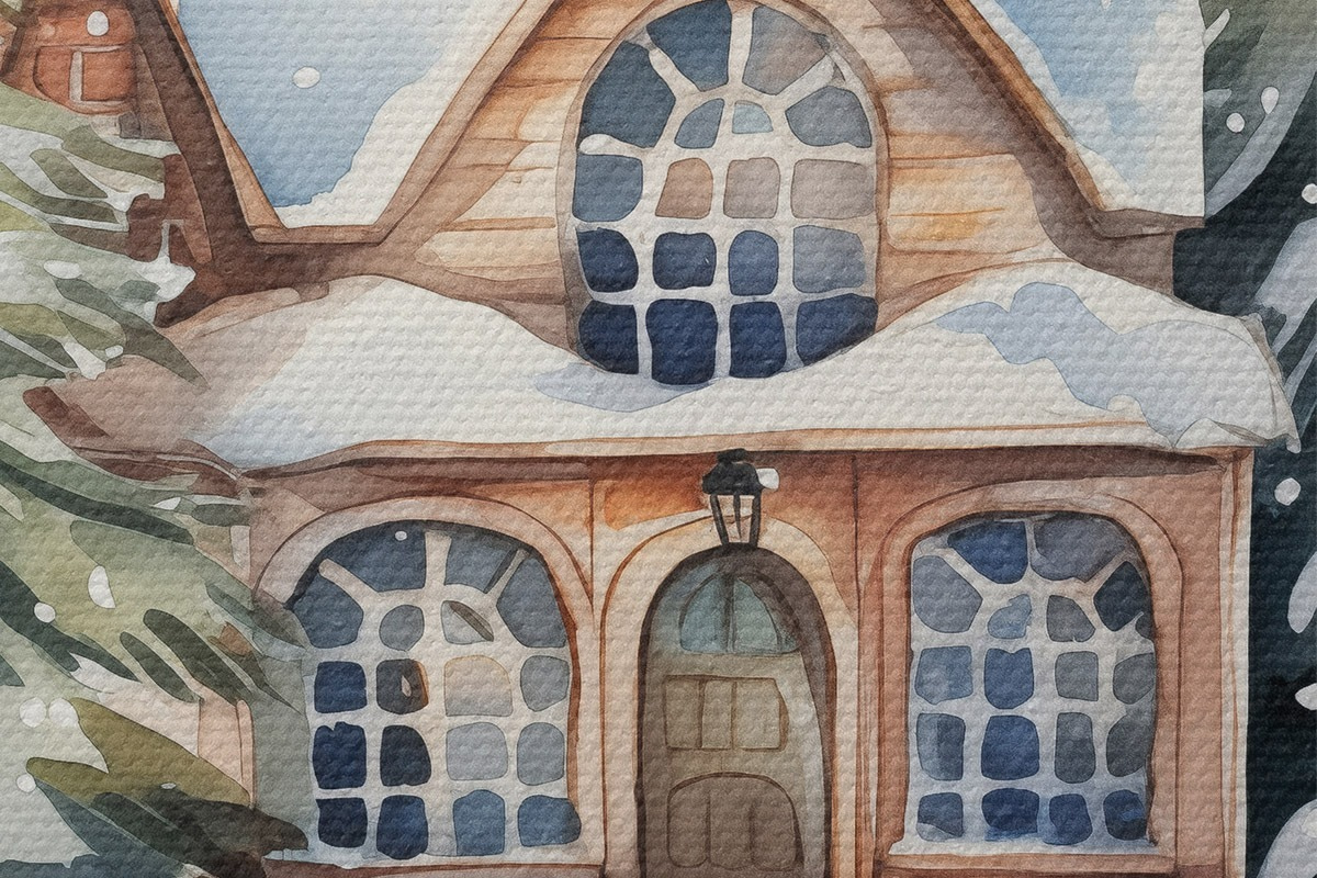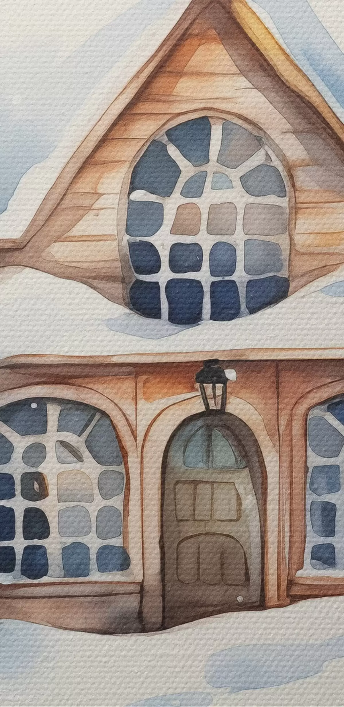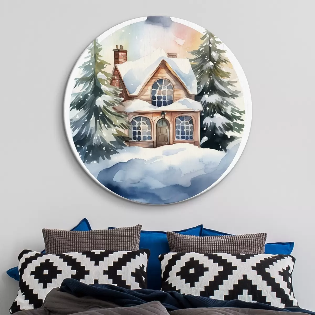 Picturi rotunde Minge decorativă de Crăciun cu o casă de zăpadă acuarelă și pini r41363
