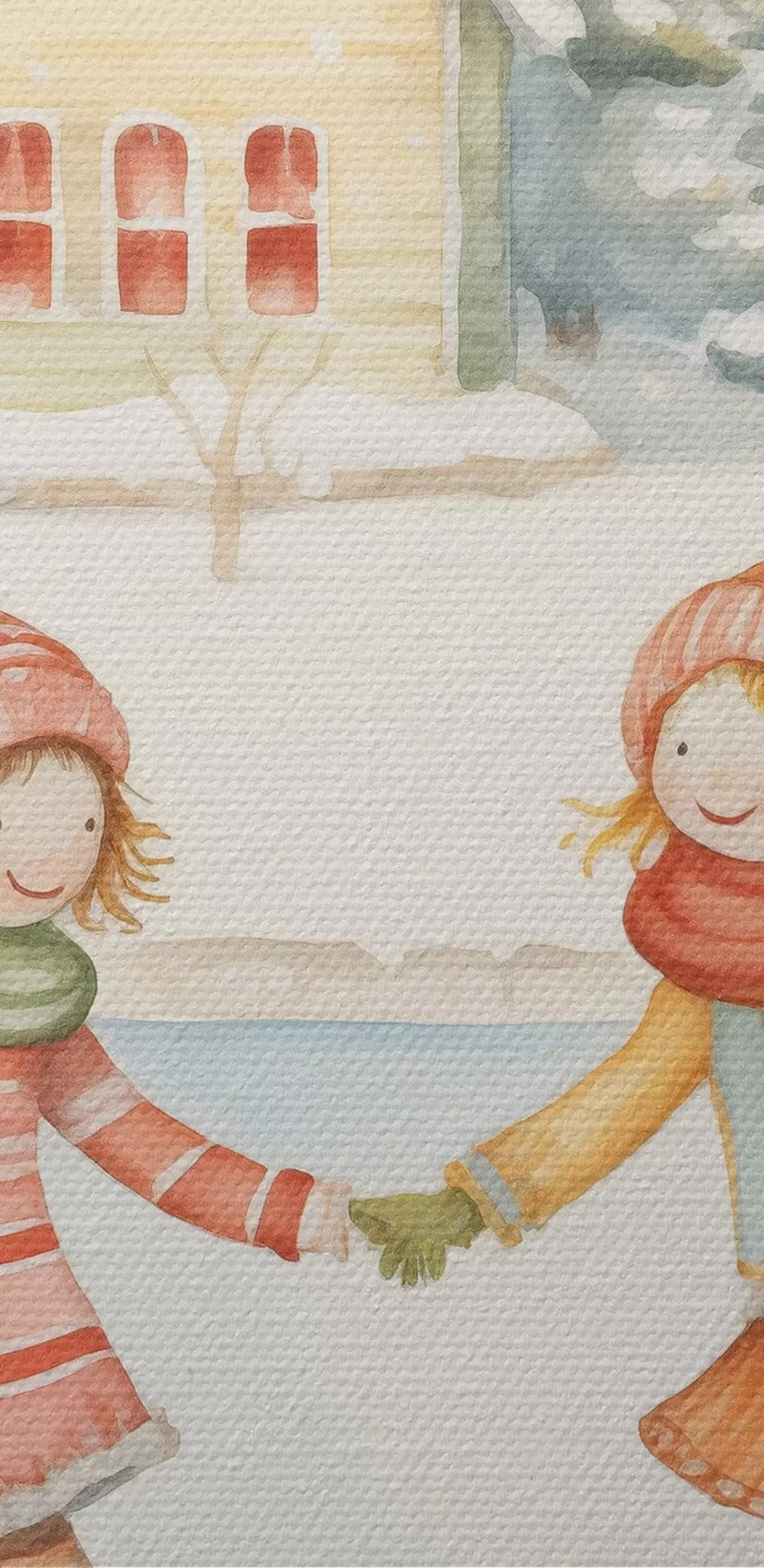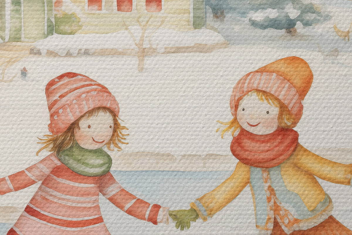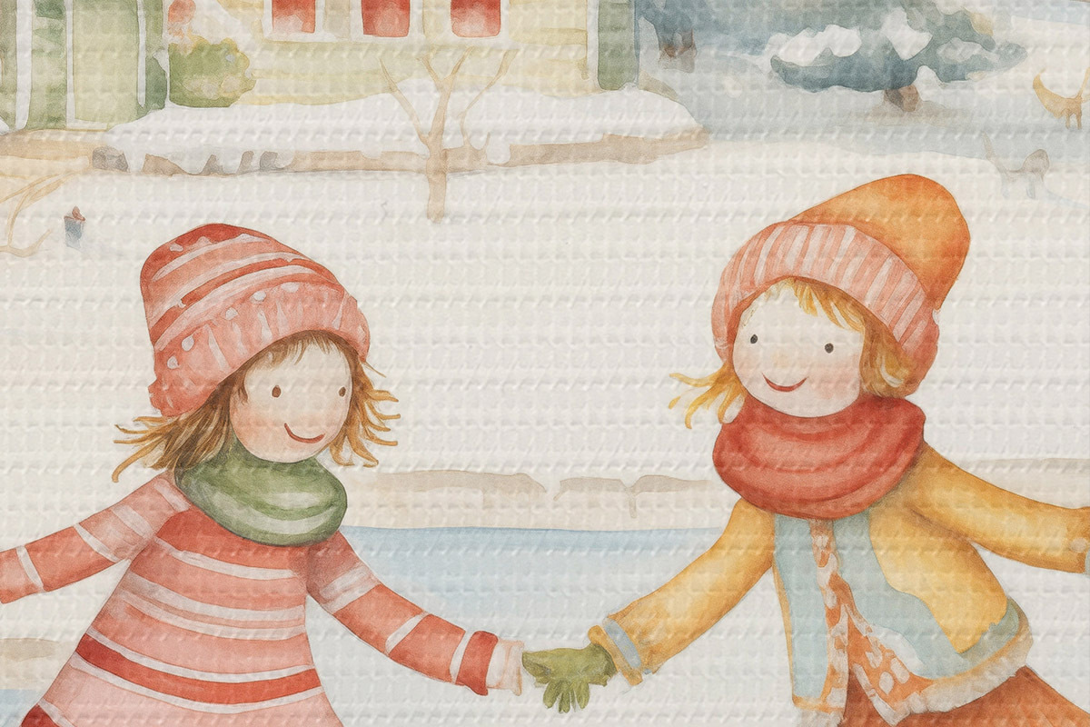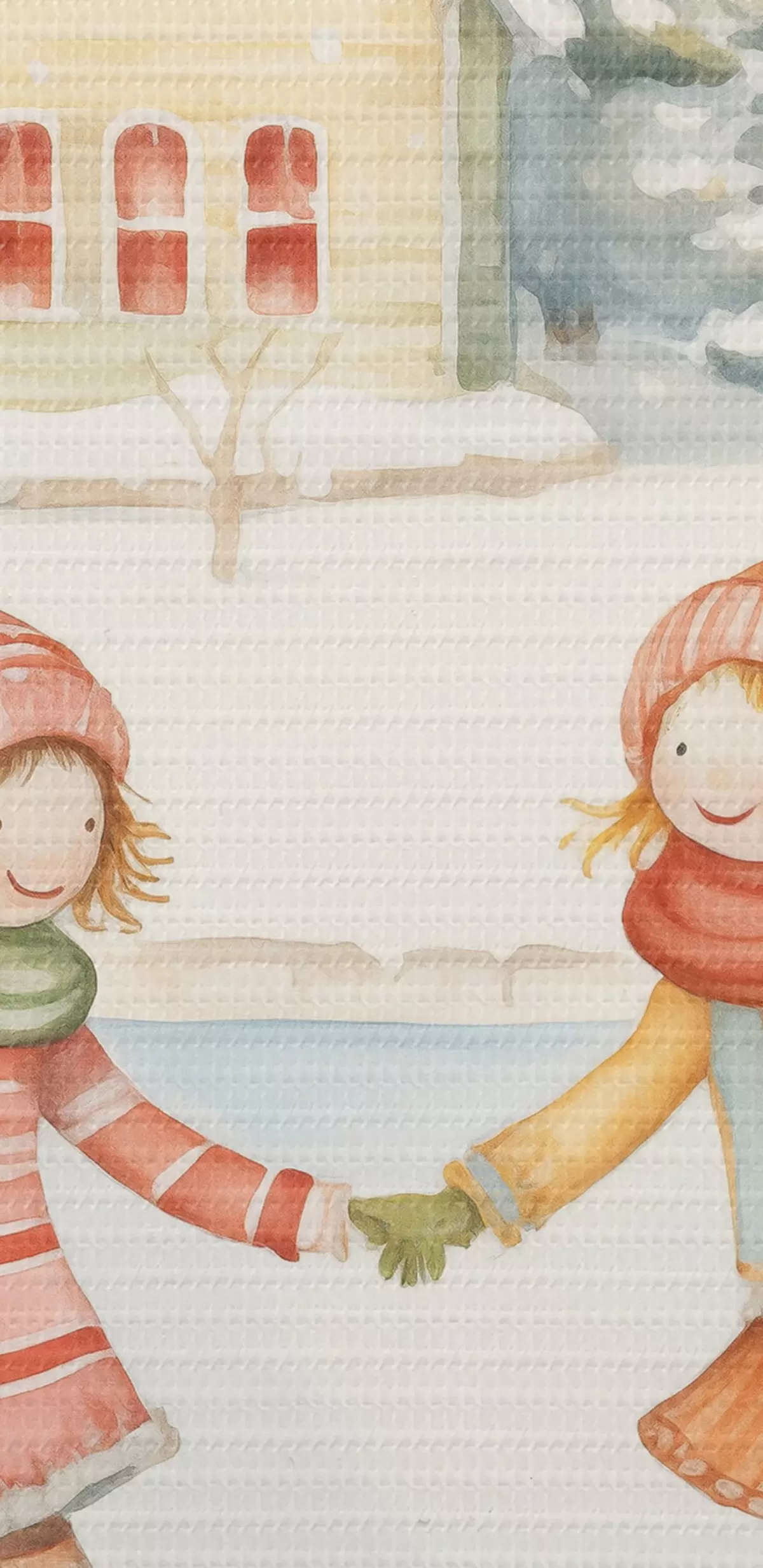 Picturi rotunde Scenă de iarnă cu două fete patinaj, oraș de iarnă, case, pădure Nr r41377