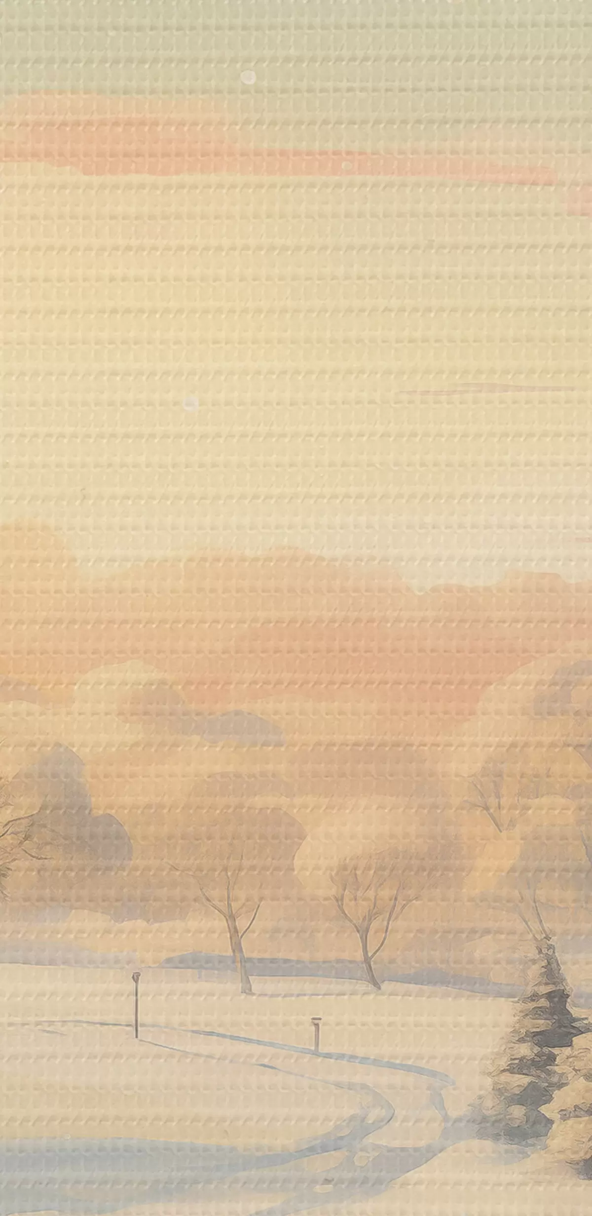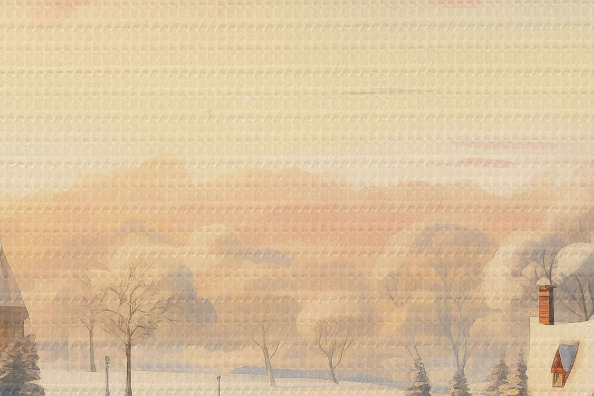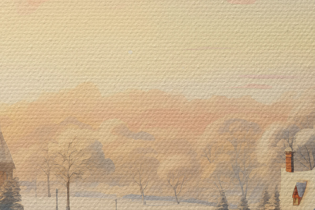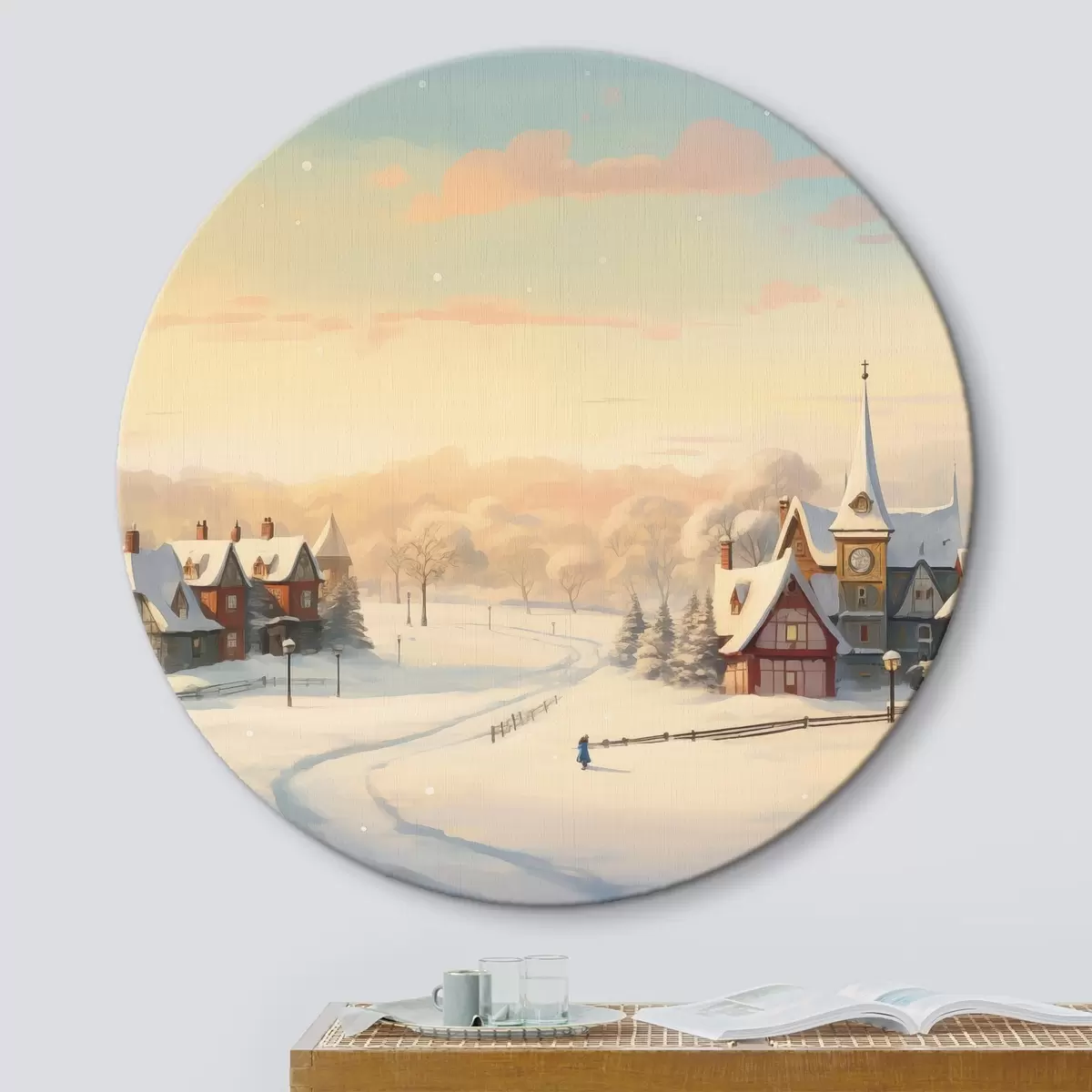 Picturi rotunde Țara minunilor de iarnă, case, cer la apus de soare, copaci, acuarelă Nr r41383