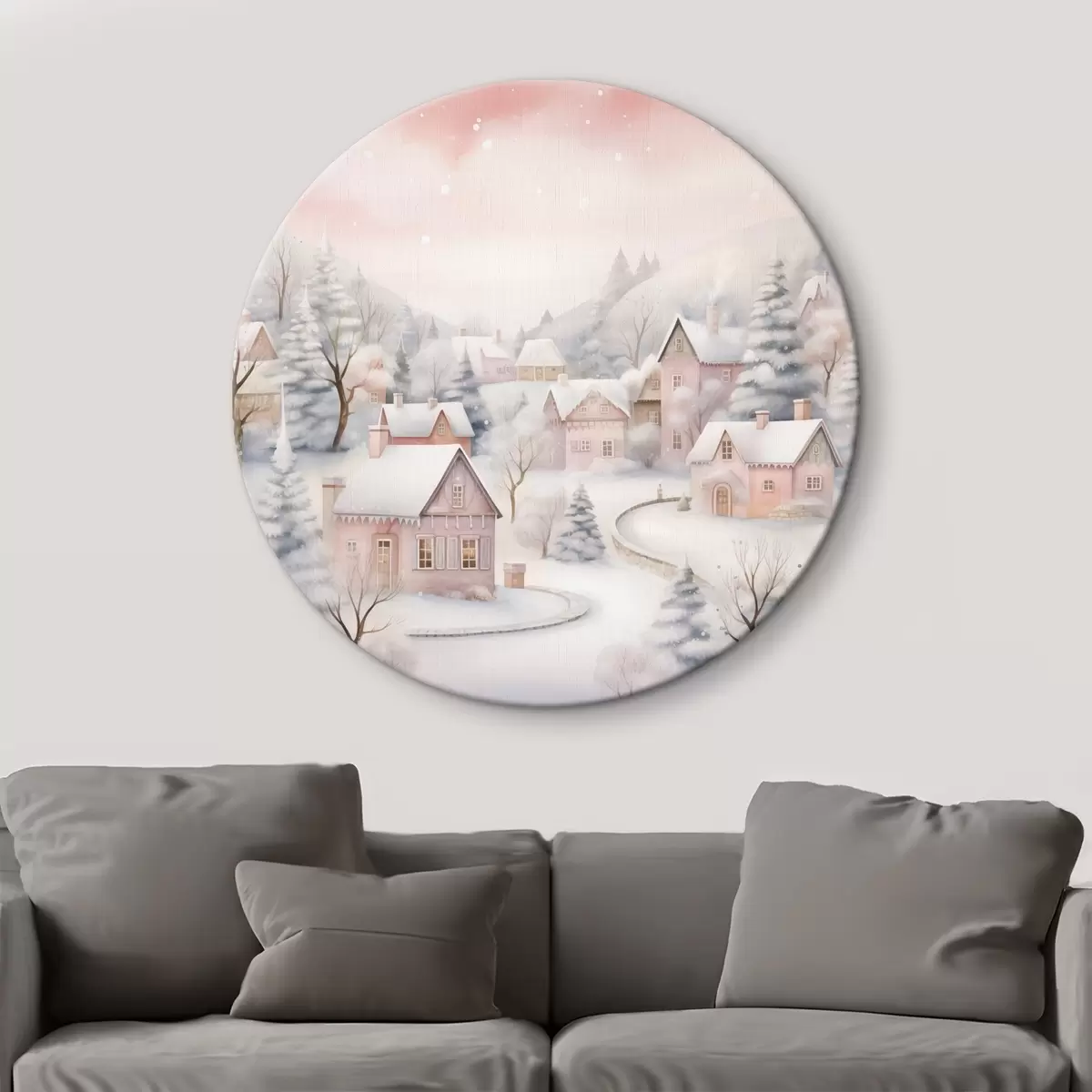 Picturi rotunde Acuarelă sat de iarnă, pădure de pini, case, munți, culori pastelate moi Nr r41388