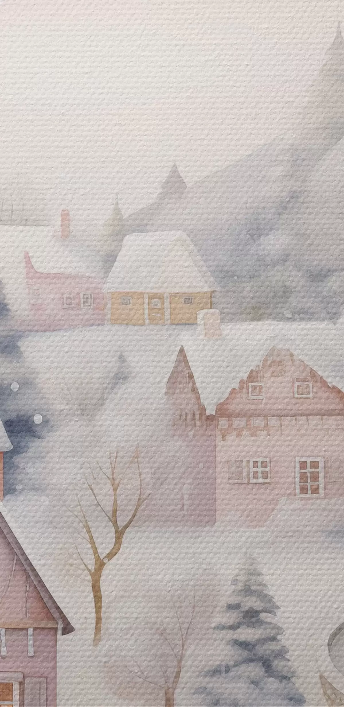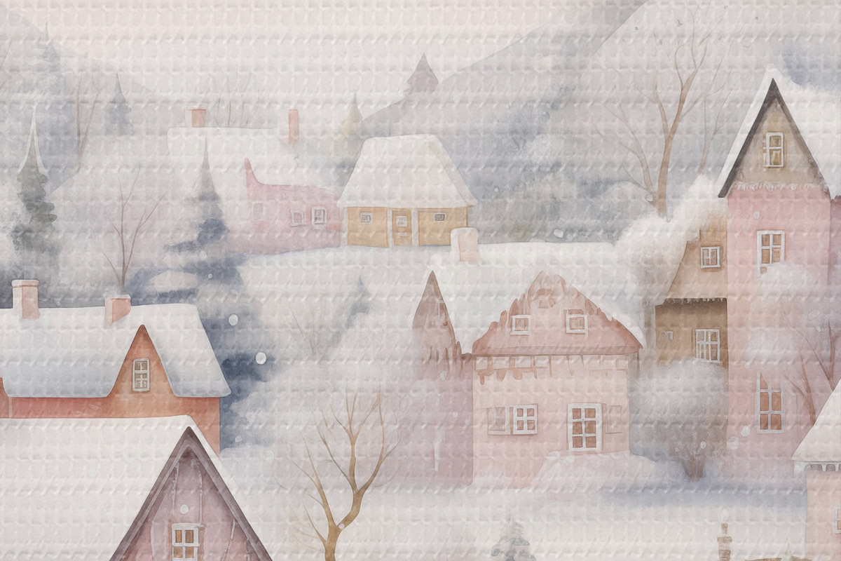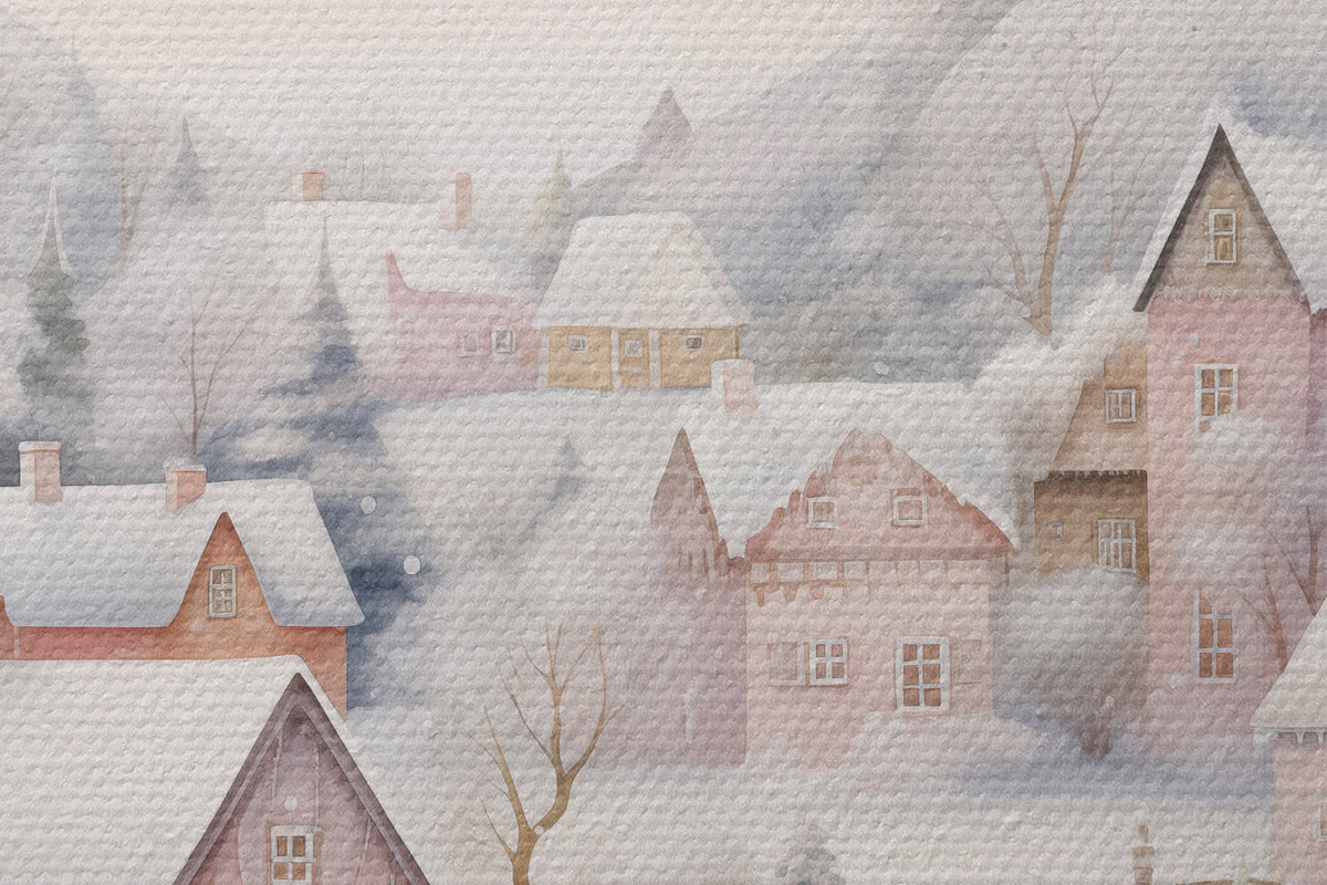Picturi rotunde Acuarelă sat de iarnă, pădure de pini, case, munți, culori pastelate moi Nr r41388