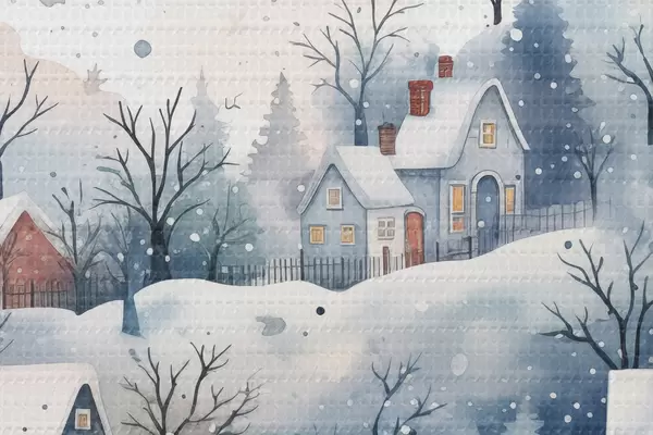 Picturi rotunde Peisaj de iarnă acuarelă cu case și pădure de pini Nr r41389