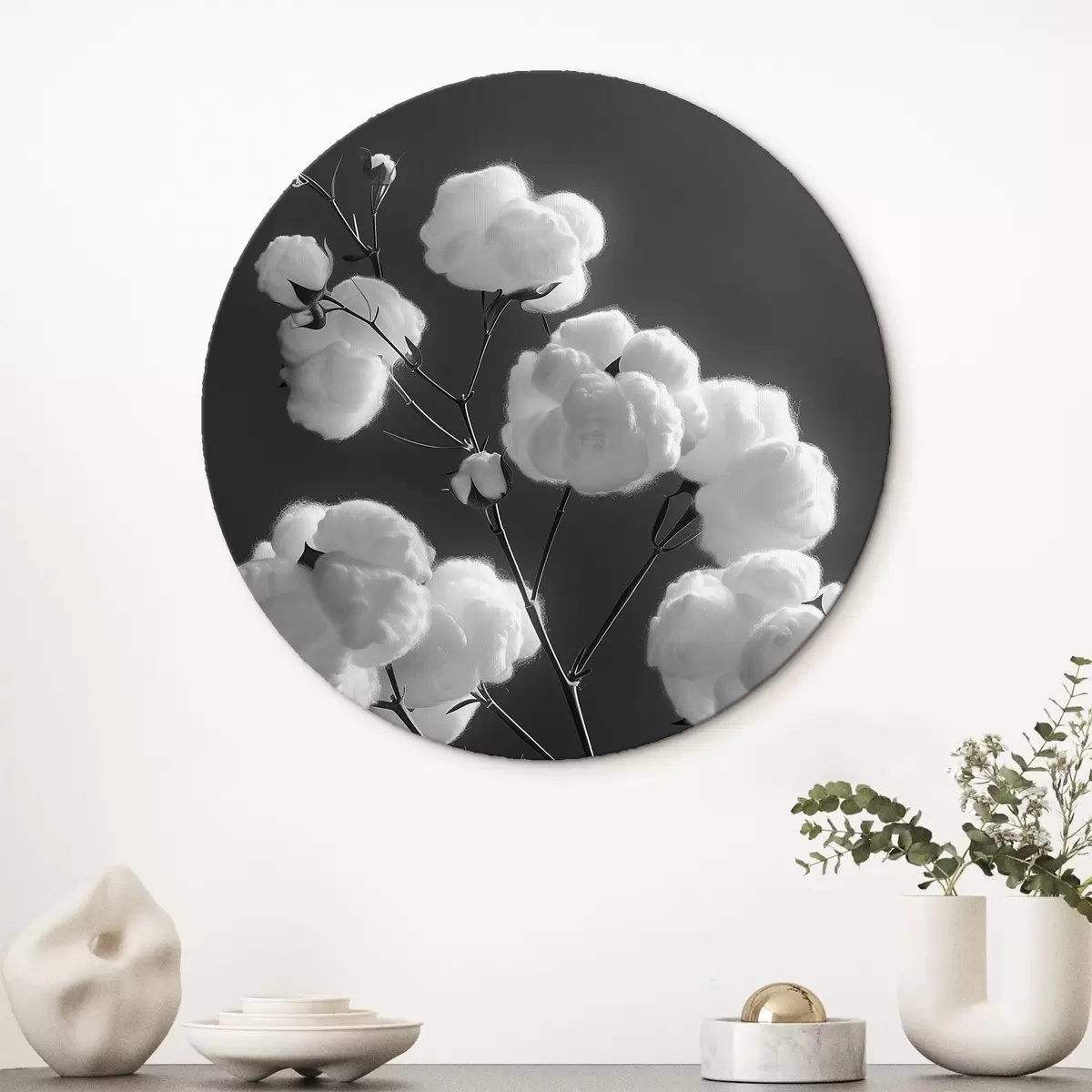 Picturi rotunde Ramuri de bumbac, versiune alb-negru Nr r41429
