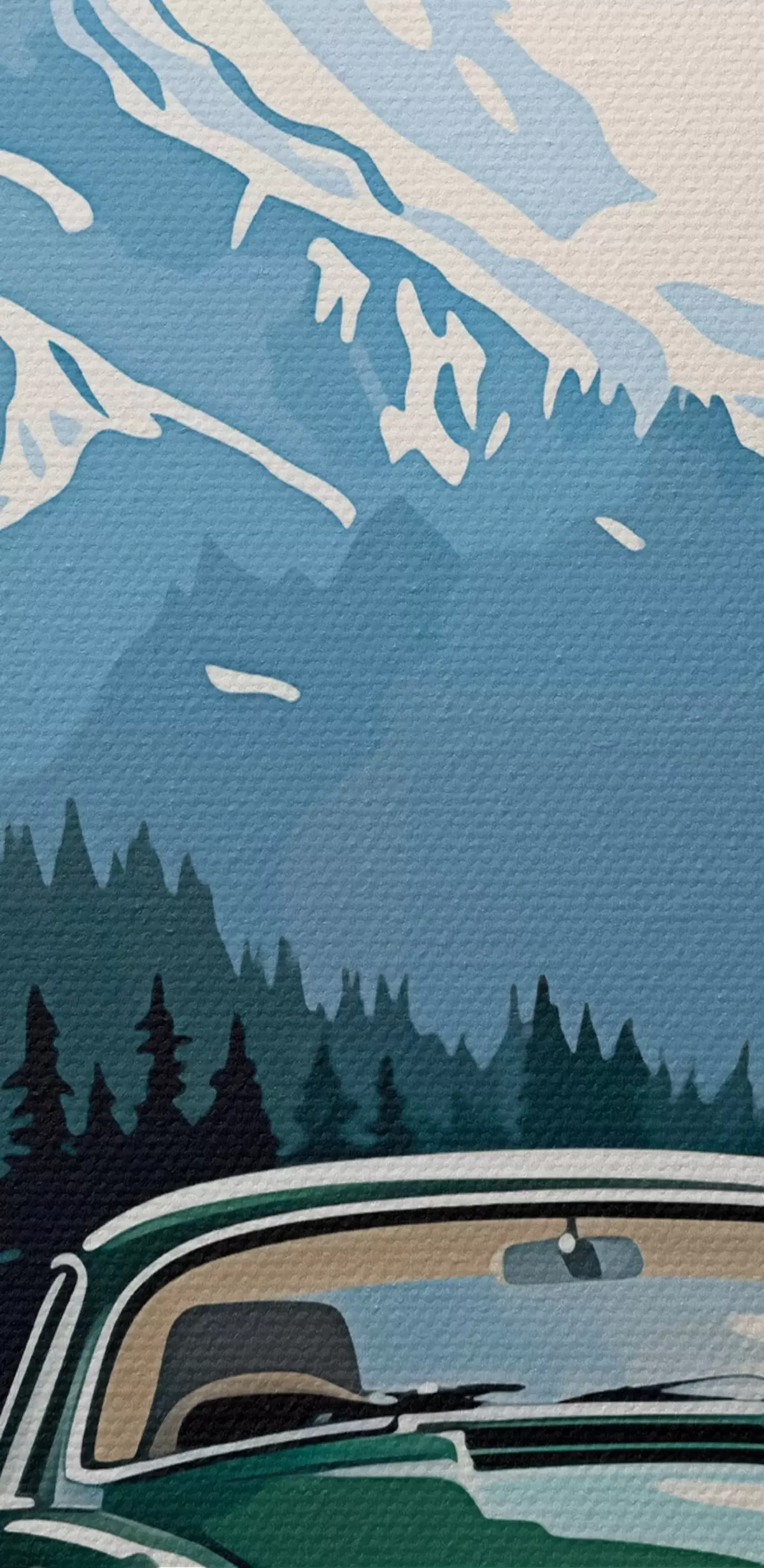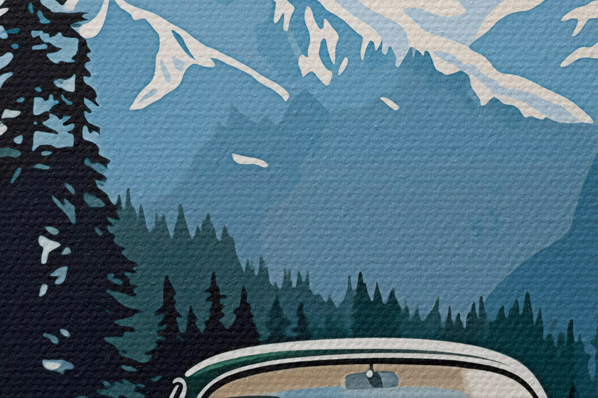Picturi rotunde Retro masina pe un drum de munte de iarnă r41478