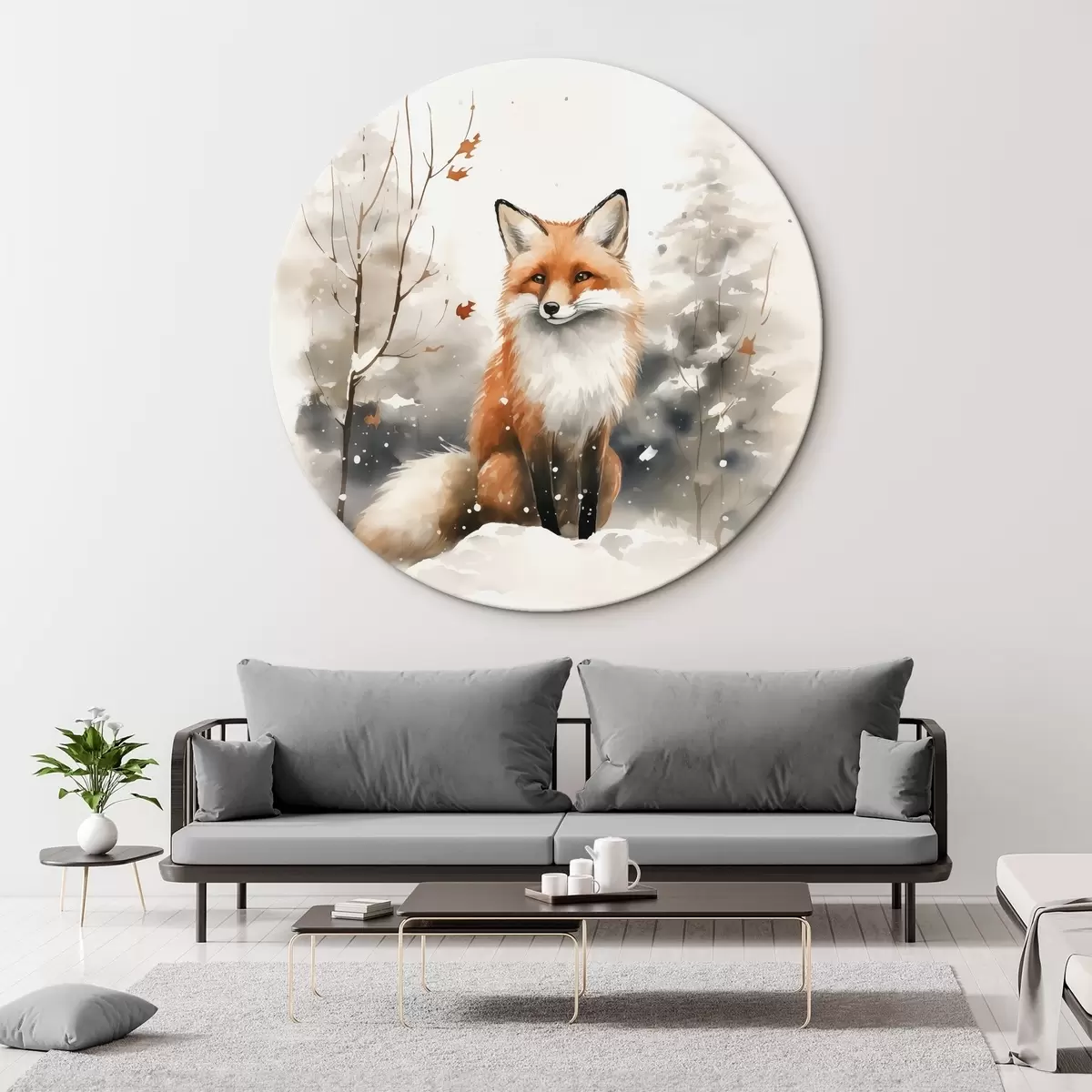 Picturi rotunde Fox pui într-o pădure de zăpadă imitație de acuarelă r42146
