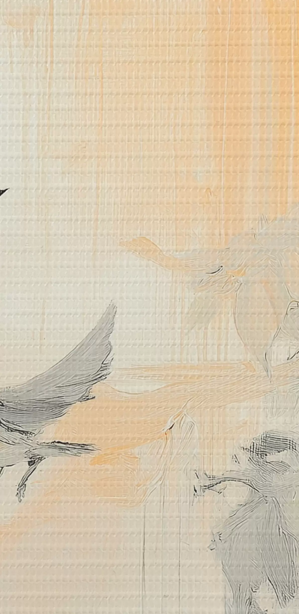 Picturi rotunde Abstracție cu păsări, stil acrilic, culori gri și bej Nr r42206