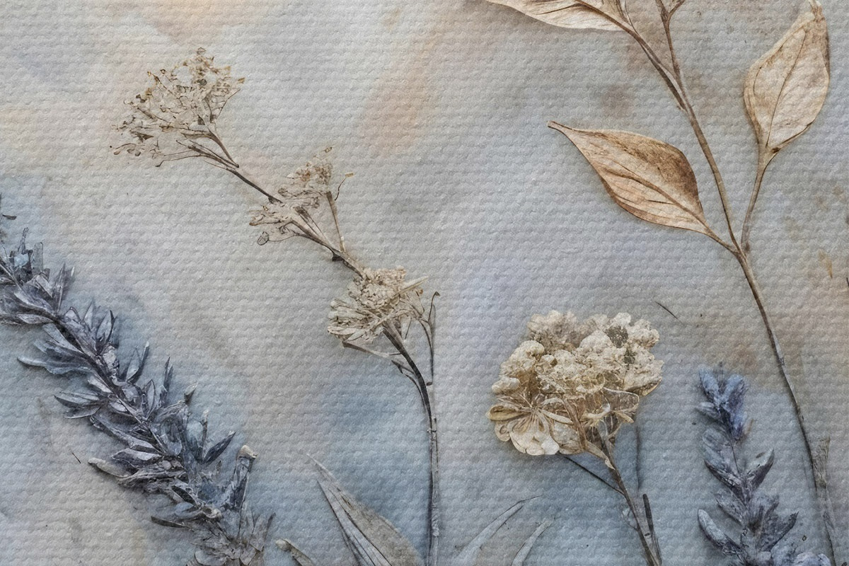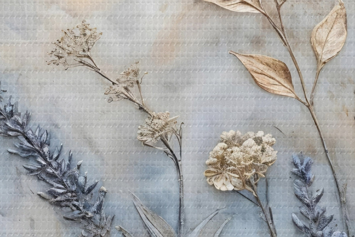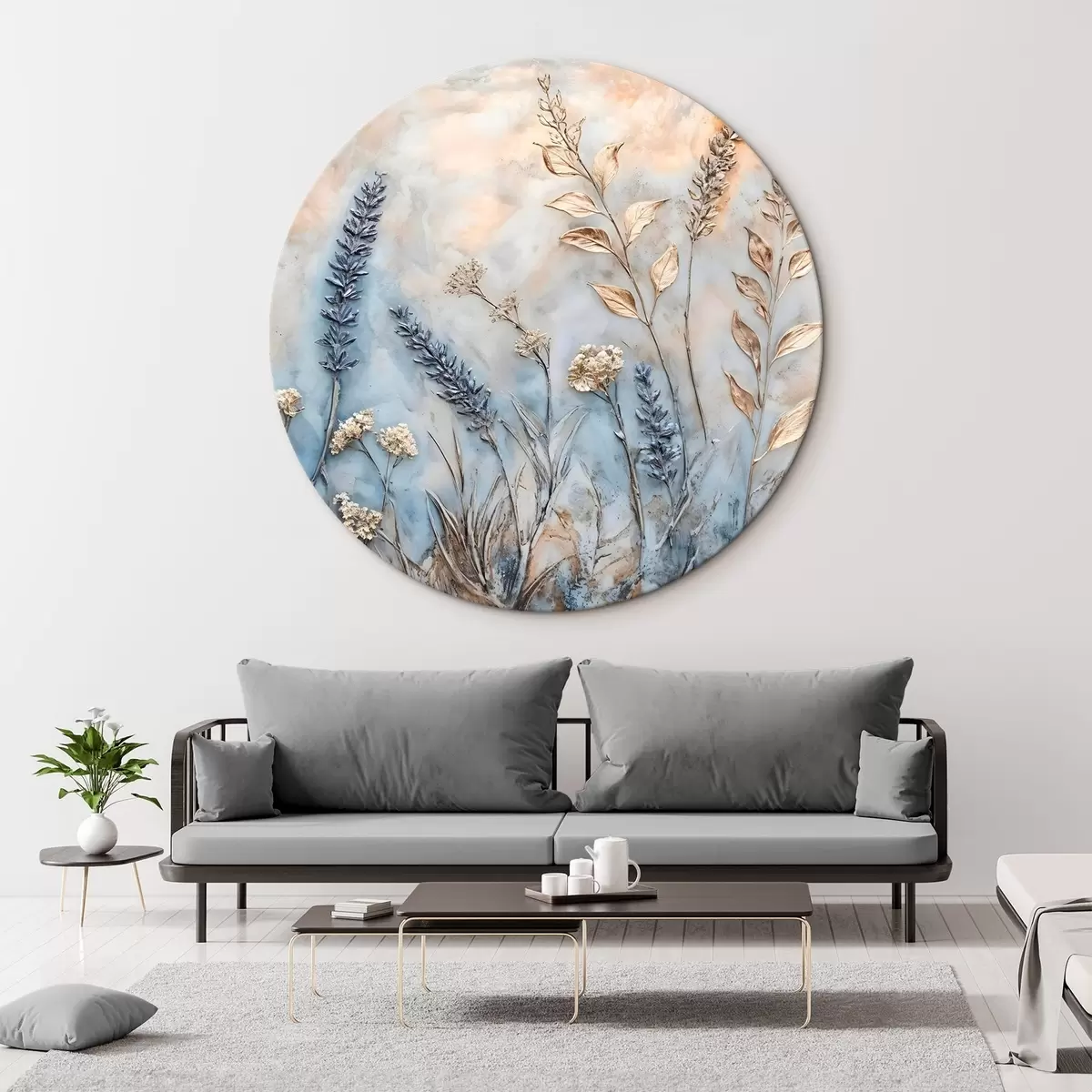 Picturi rotunde Un câmp de diverse flori sălbatice și plante în nuanțe de albastru, alb și bej pe un fundal moale, cețos Nr r42214