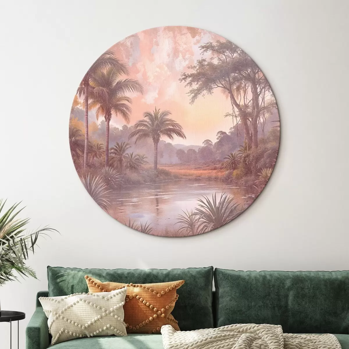 Picturi rotunde Un peisaj tropical texturat cu un lac liniștit înconjurat de palmieri luxurianți și alte frunzișuri Nr r42219