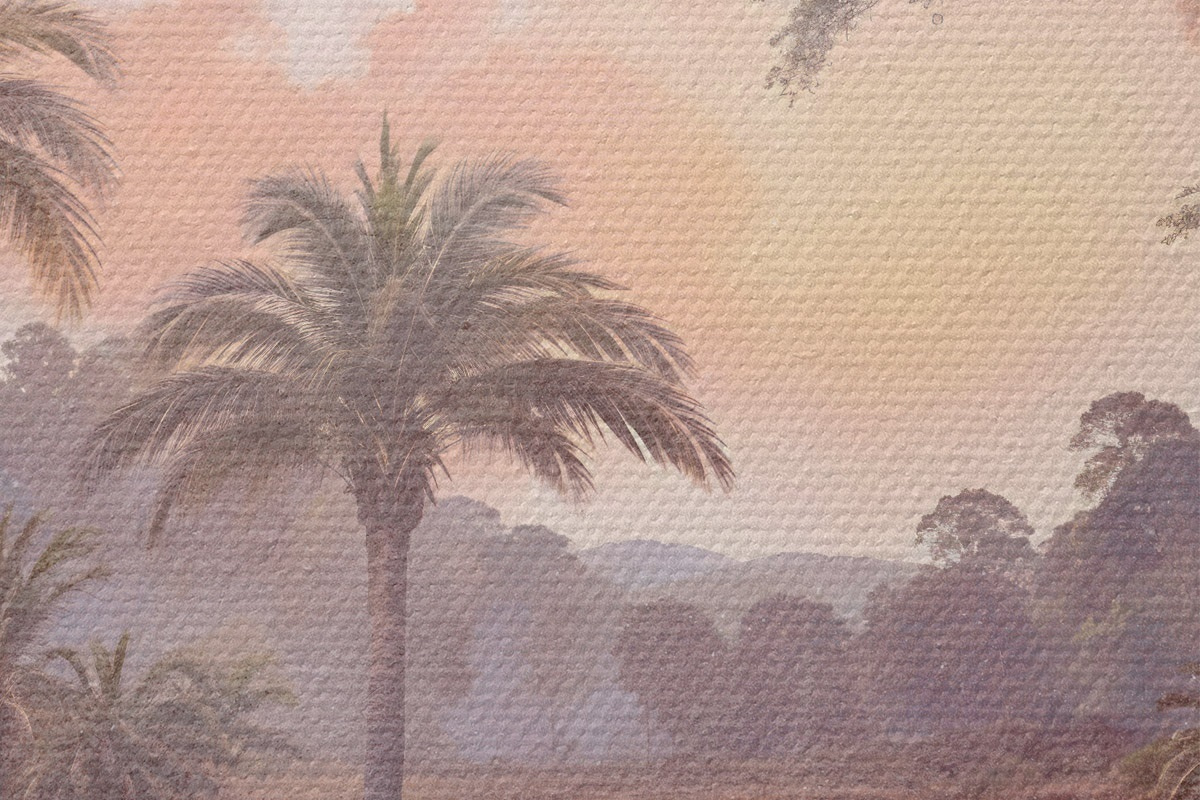 Picturi rotunde Un peisaj tropical texturat cu un lac liniștit înconjurat de palmieri luxurianți și alte frunzișuri r42219