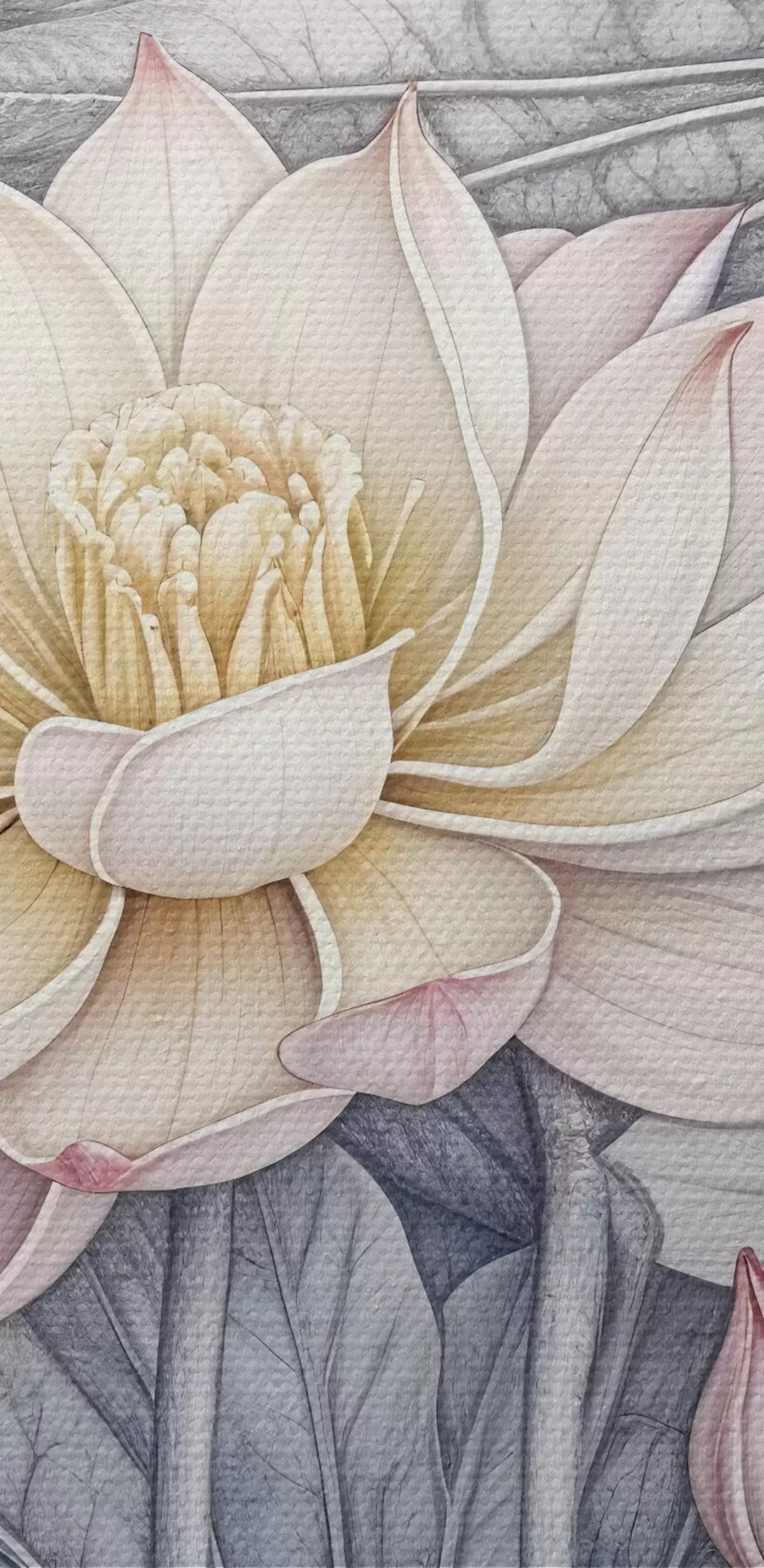 Picturi rotunde Flori mari de lotus roz și albe cu frunze și tulpini verzi pe un fundal deschis cu petale și centre detaliate Nr r42221