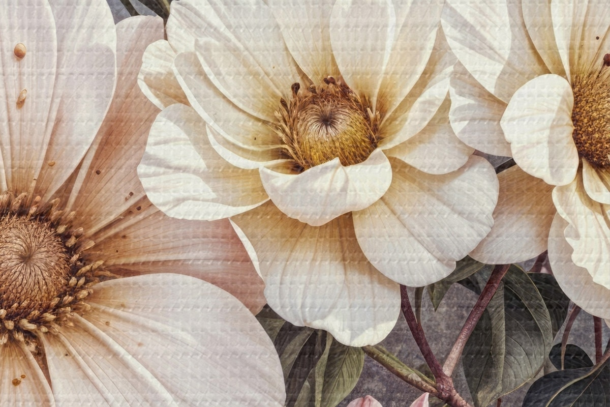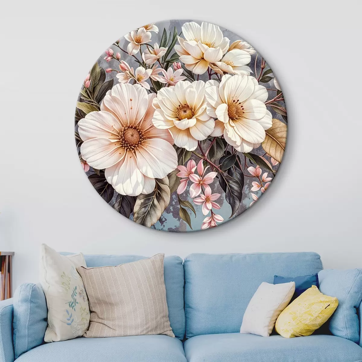 Picturi rotunde Un buchet vibrant de flori dahlia mari, albe și roz, detaliate, cu frunze verzi pe un fundal închis Nr r42227