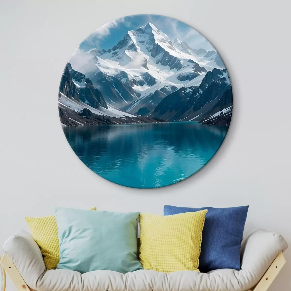 Picturi rotunde Un vârf de munte acoperit de zăpadă reflectat într-un lac liniștit turcoaz, înconjurat de teren stâncos și nori dramatici r42232