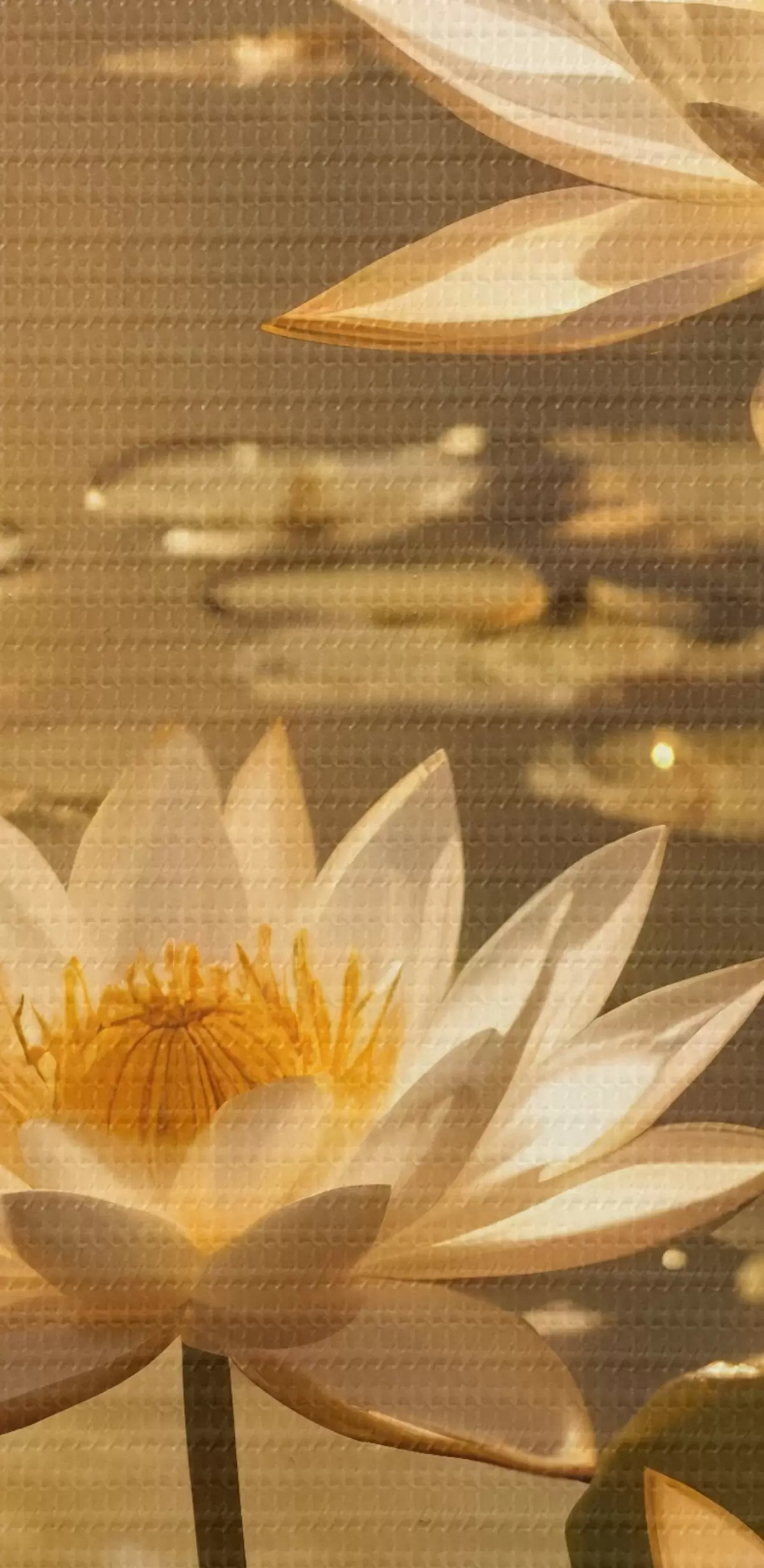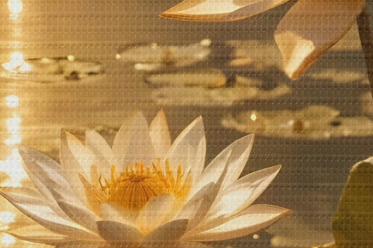 Picturi rotunde Flori albe de lotus plutind pe un iaz calm cu soarele, creând o atmosferă senină și liniștită r42239