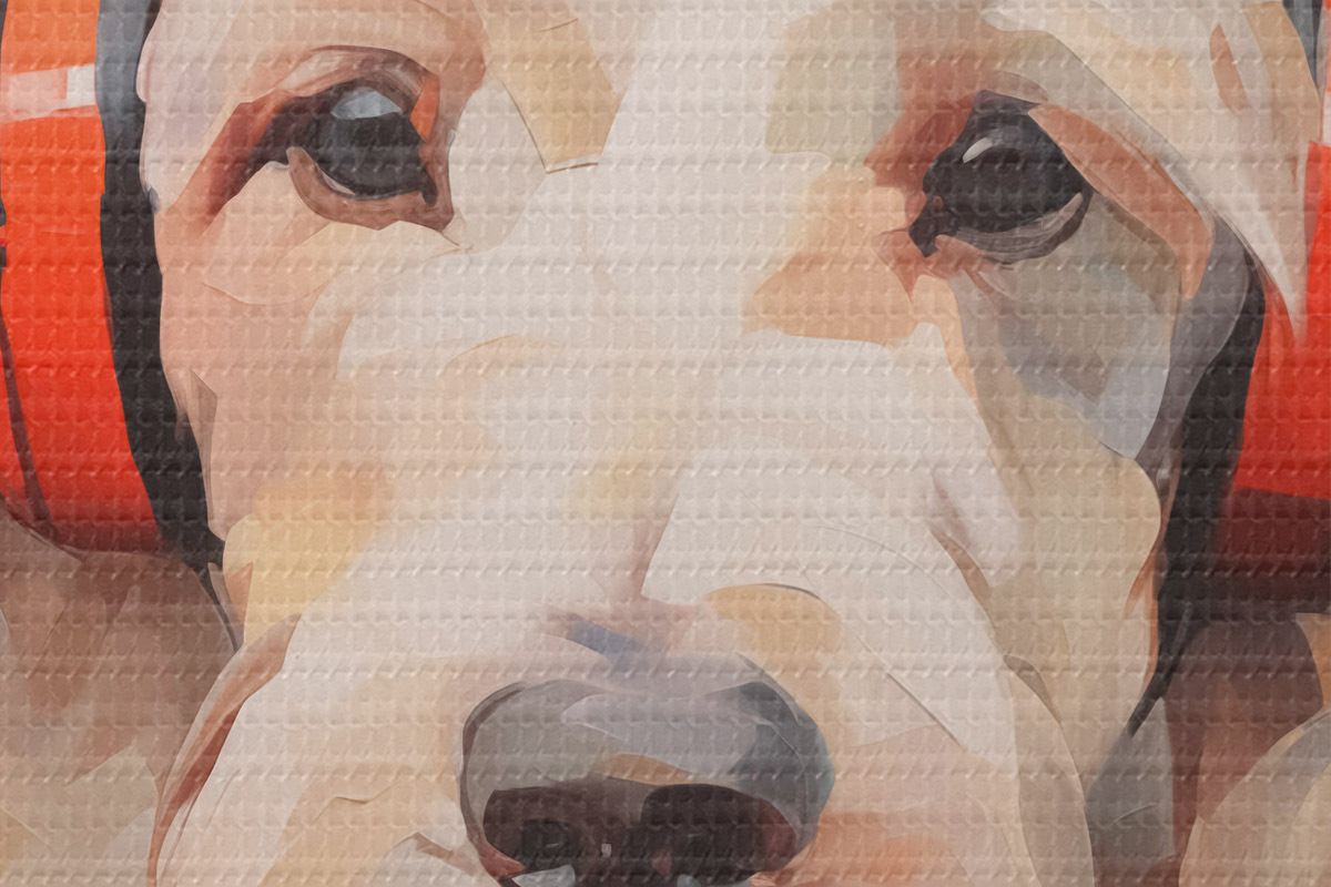 Picturi rotunde Câine alb cu jachetă portocalie și căști imitare pictură Nr r42364