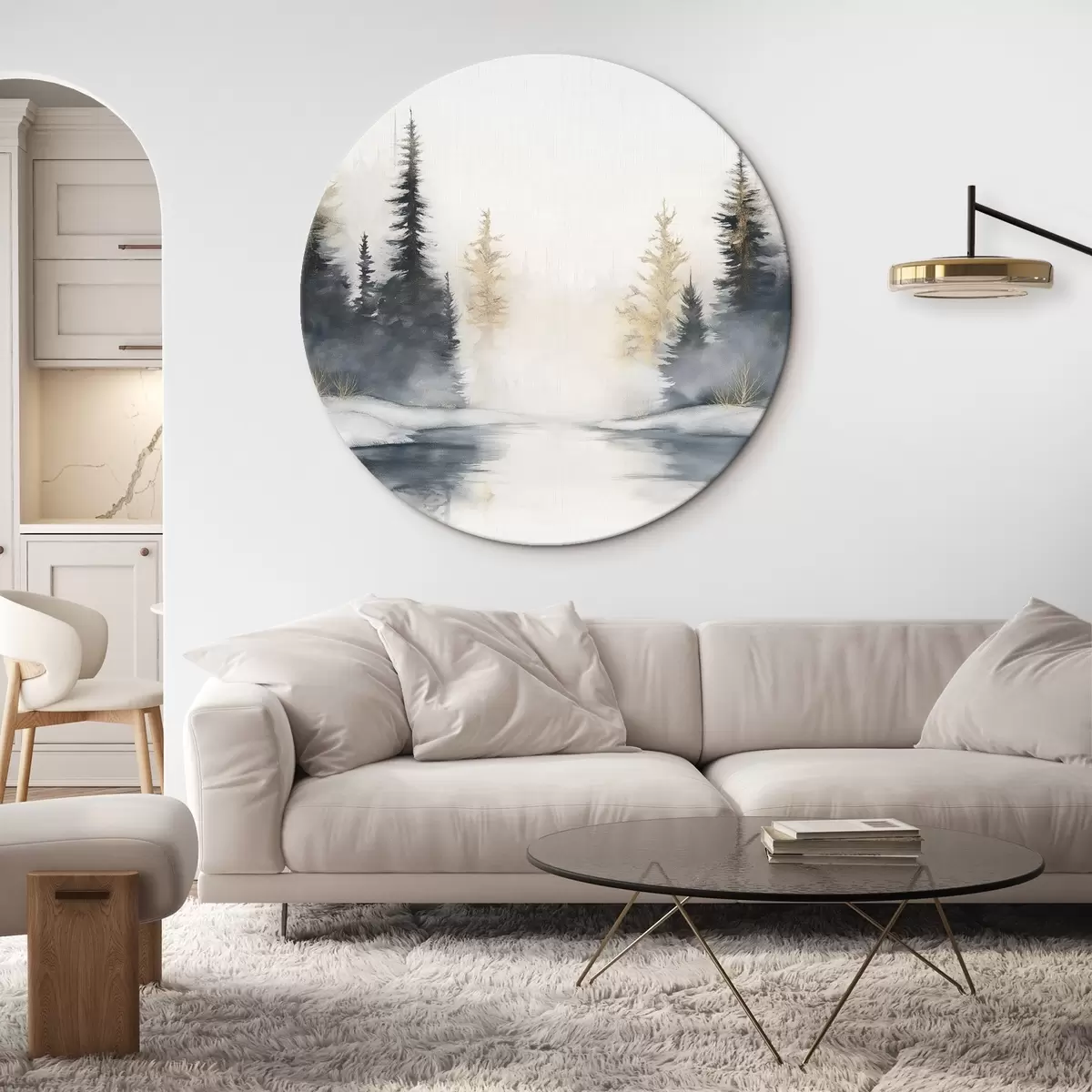 Picturi rotunde Peisaj de iarnă cu râu și pini, natură, pădure, ceață Nr r42374