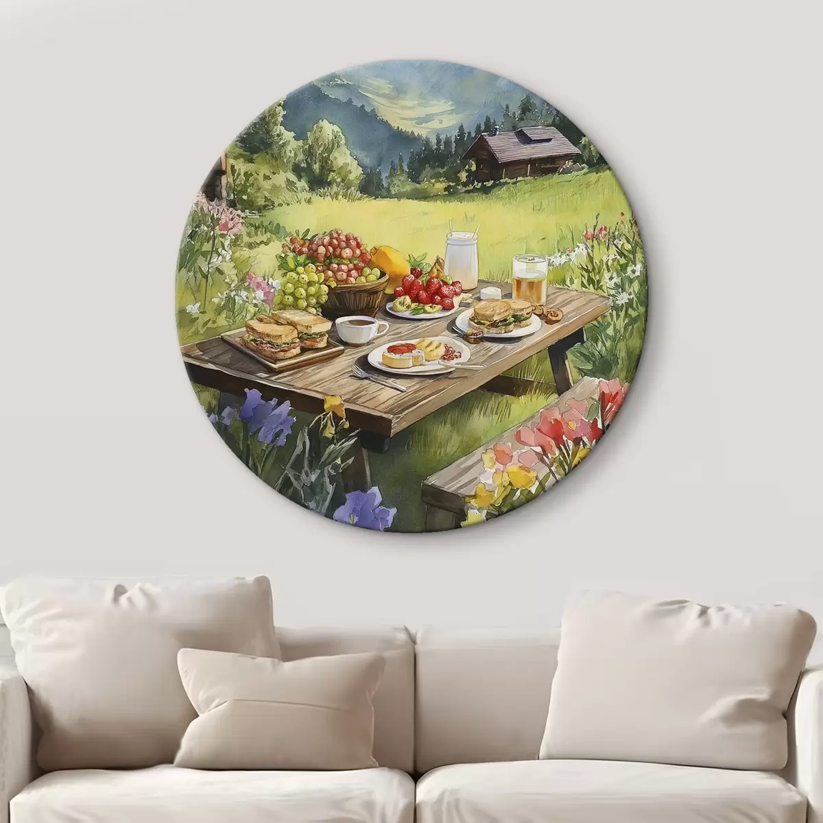 Picturi rotunde Peisaje montane, pajiște de vară, case din lemn, mic dejun Nr r42425