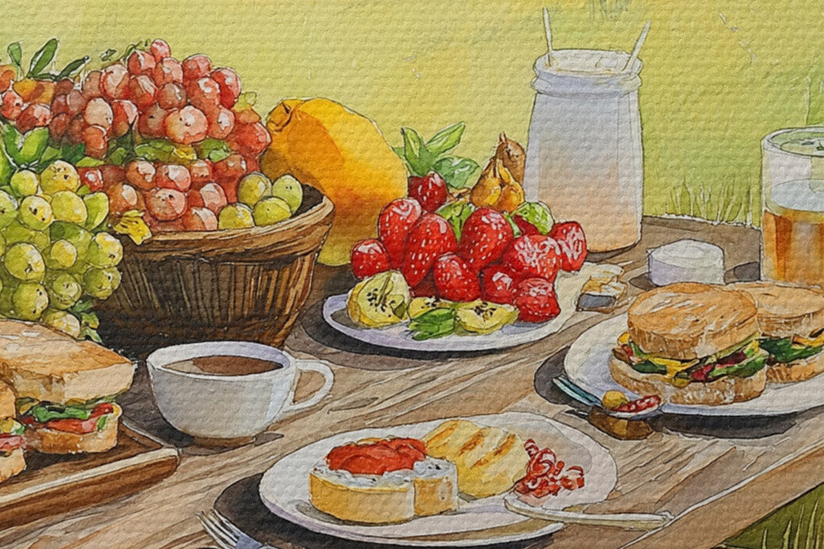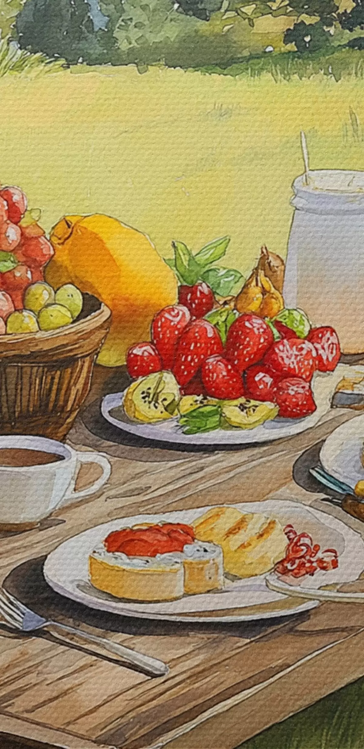 Picturi rotunde Peisaje montane, pajiște de vară, case din lemn, mic dejun r42425