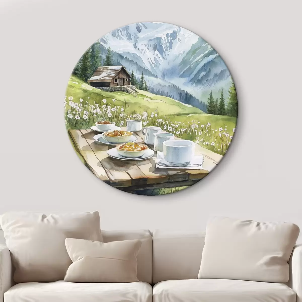 Picturi rotunde Mic dejun în Alpi, munți, pădure, natură, vară, stil acuarelă r42426