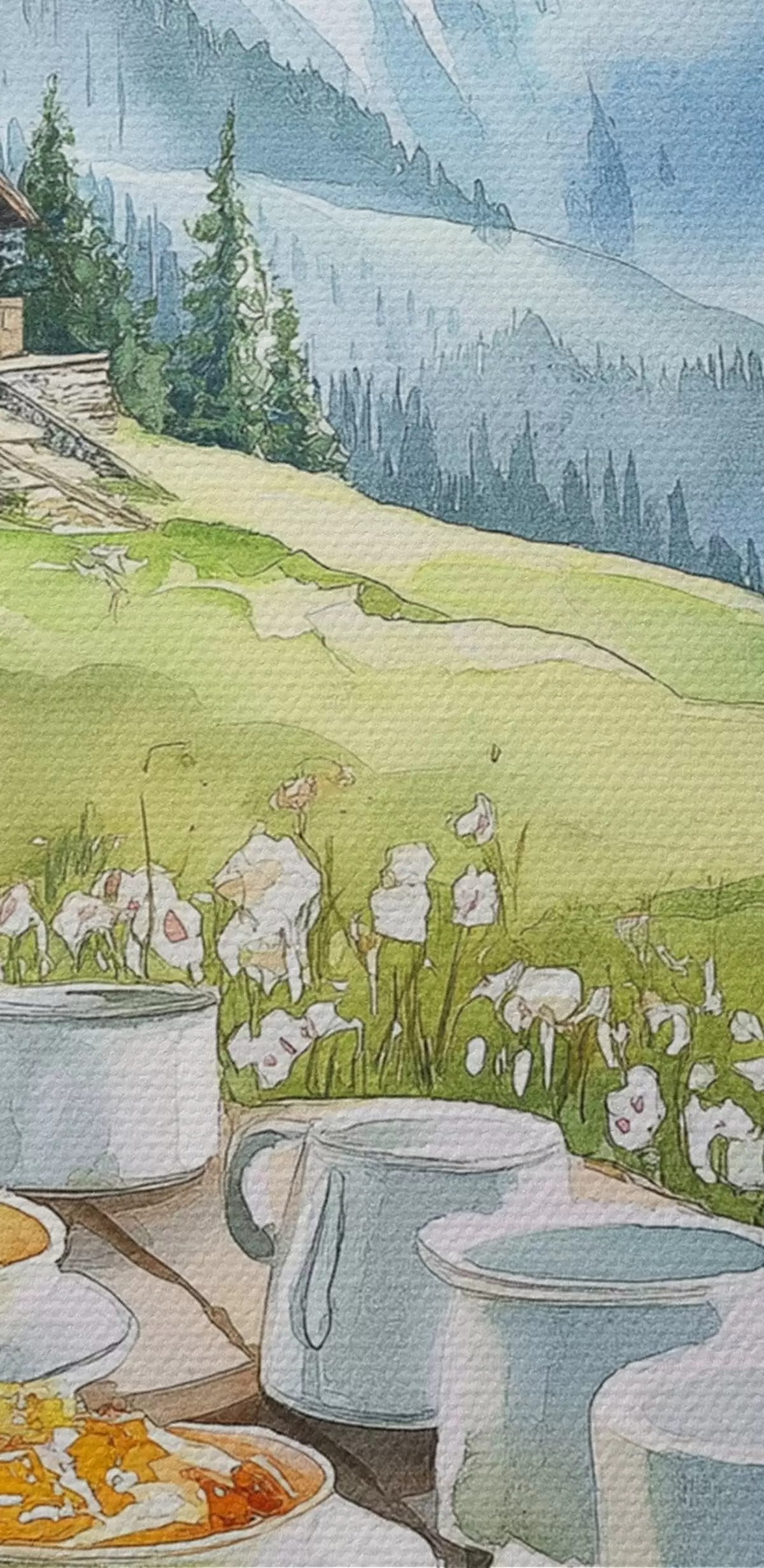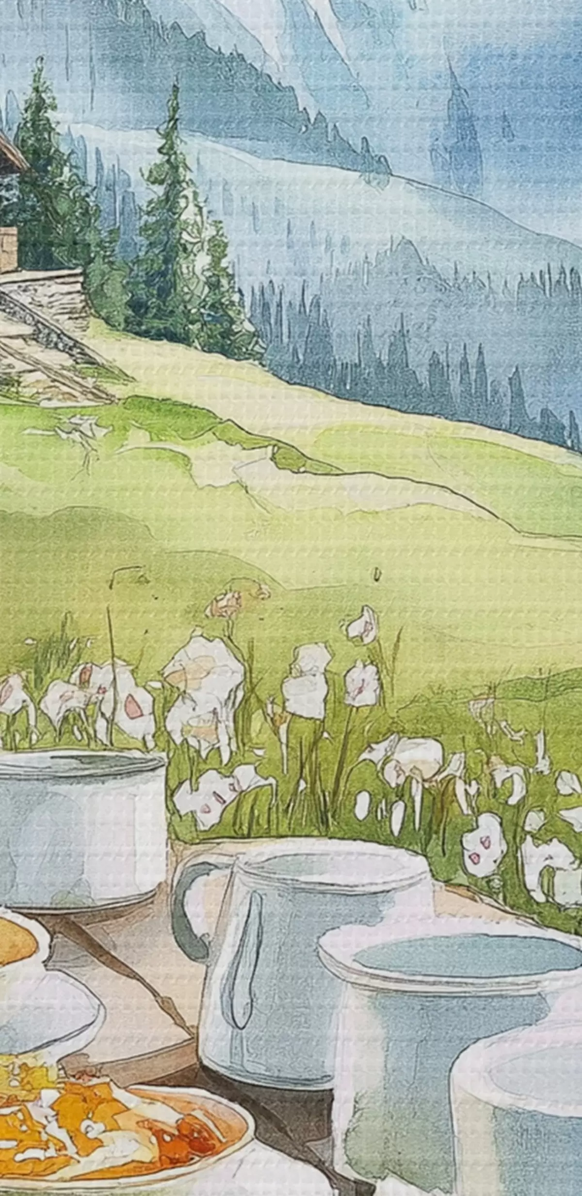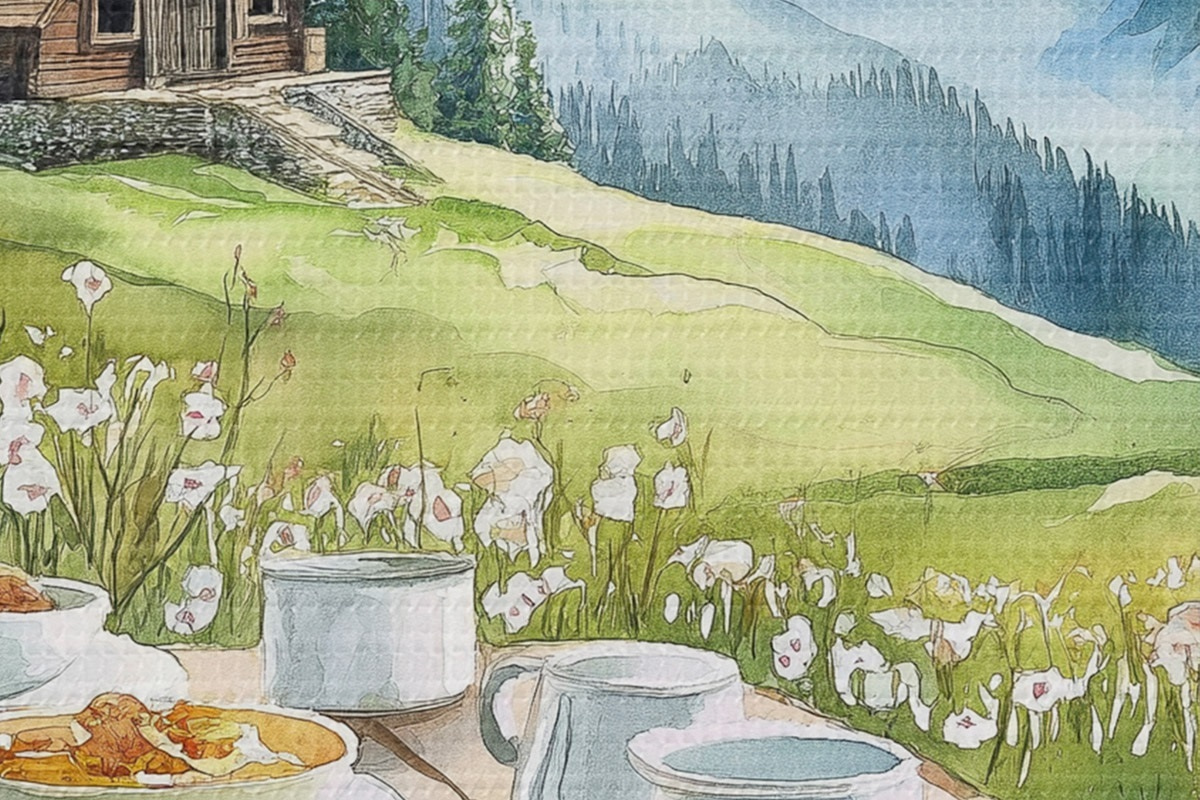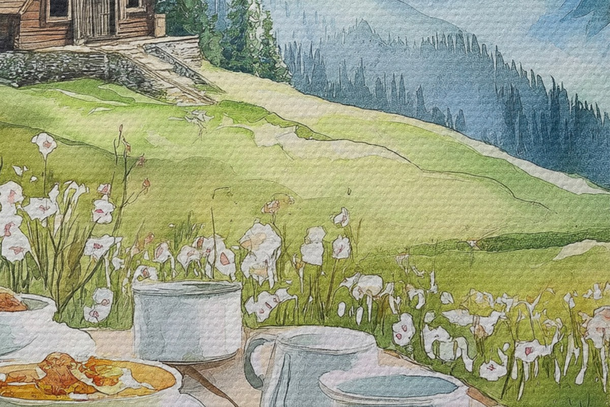 Picturi rotunde Mic dejun în Alpi, munți, pădure, natură, vară, stil acuarelă r42426