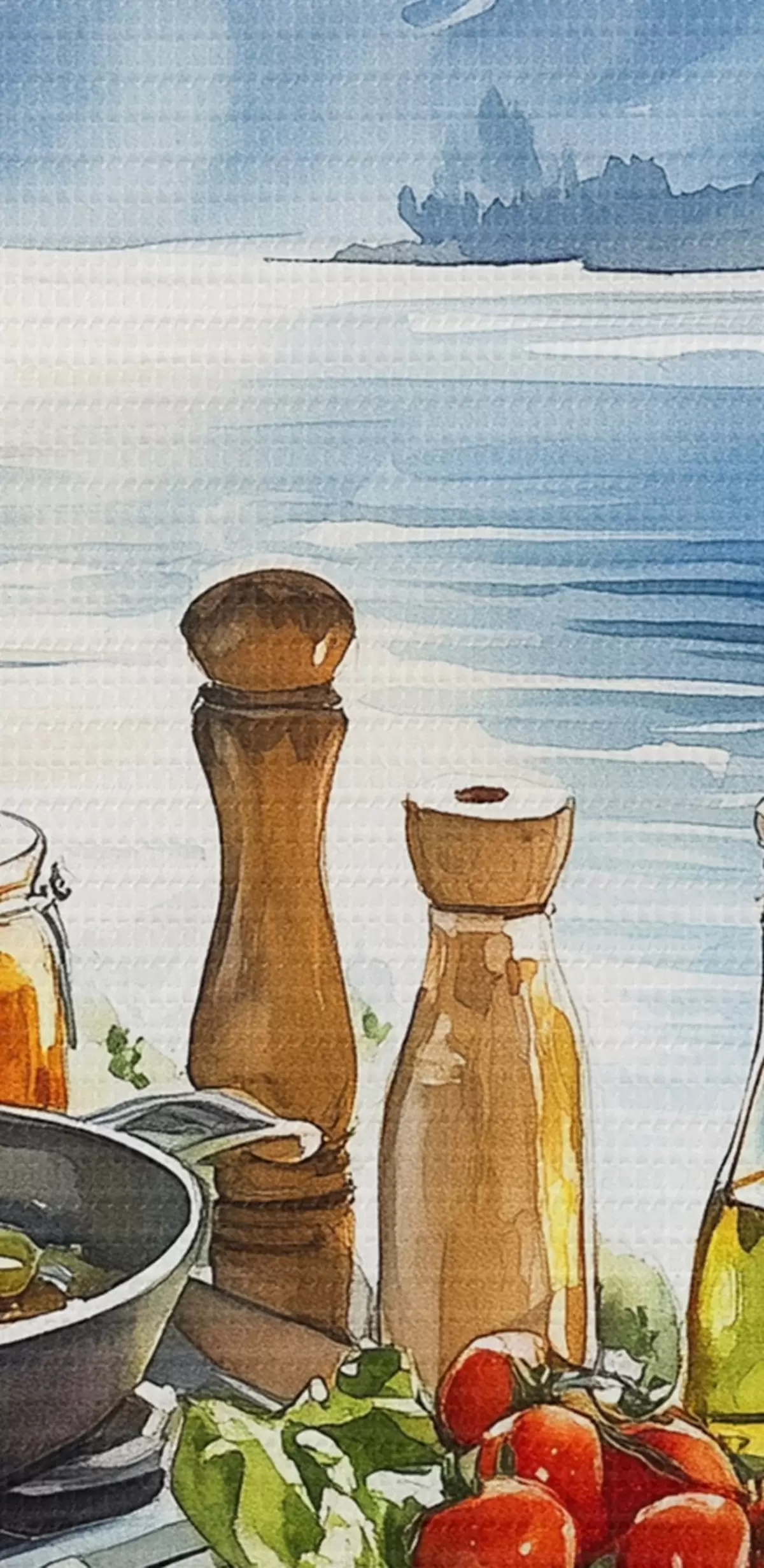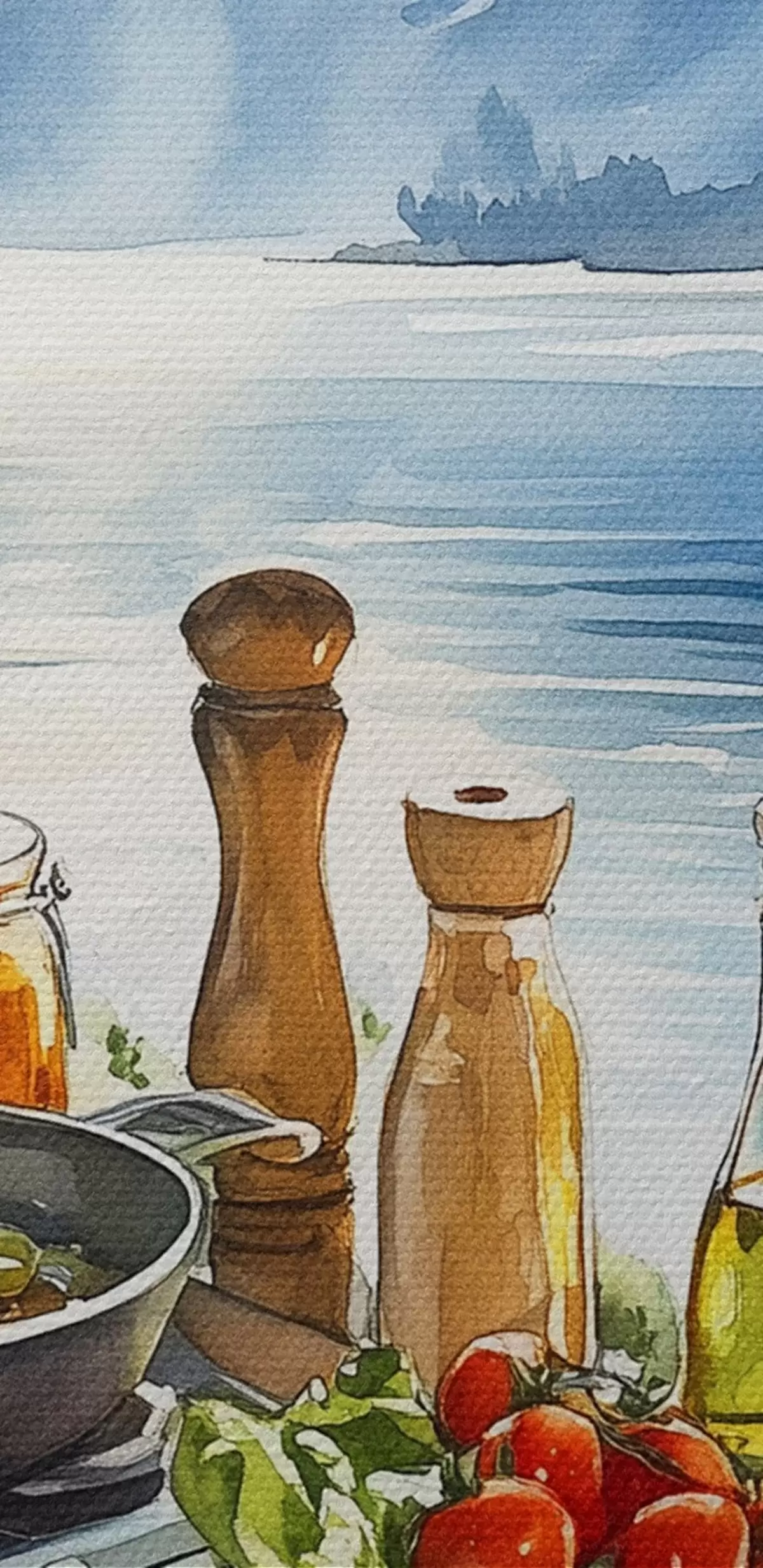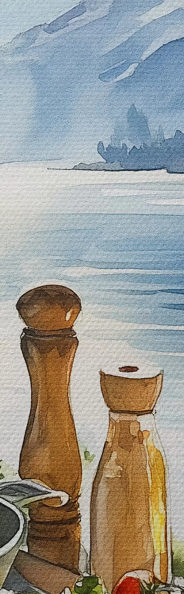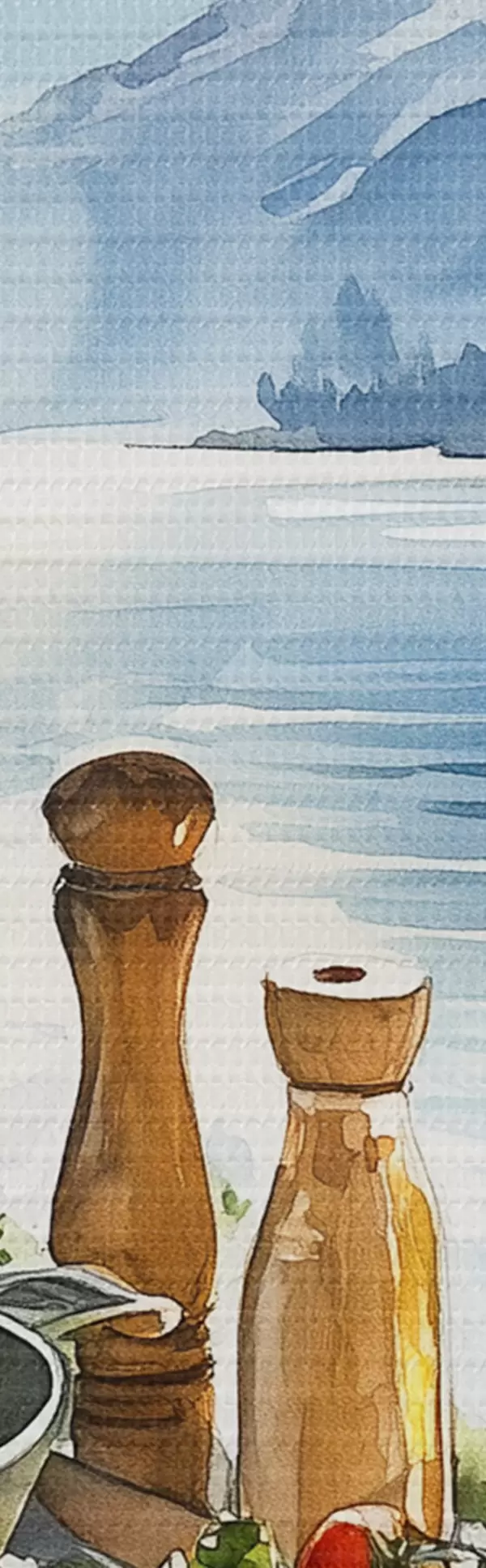 Picturi rotunde Frumoasă dimineață de vară, lac, stil acuarelă, mic dejun, călătorie Nr r42433