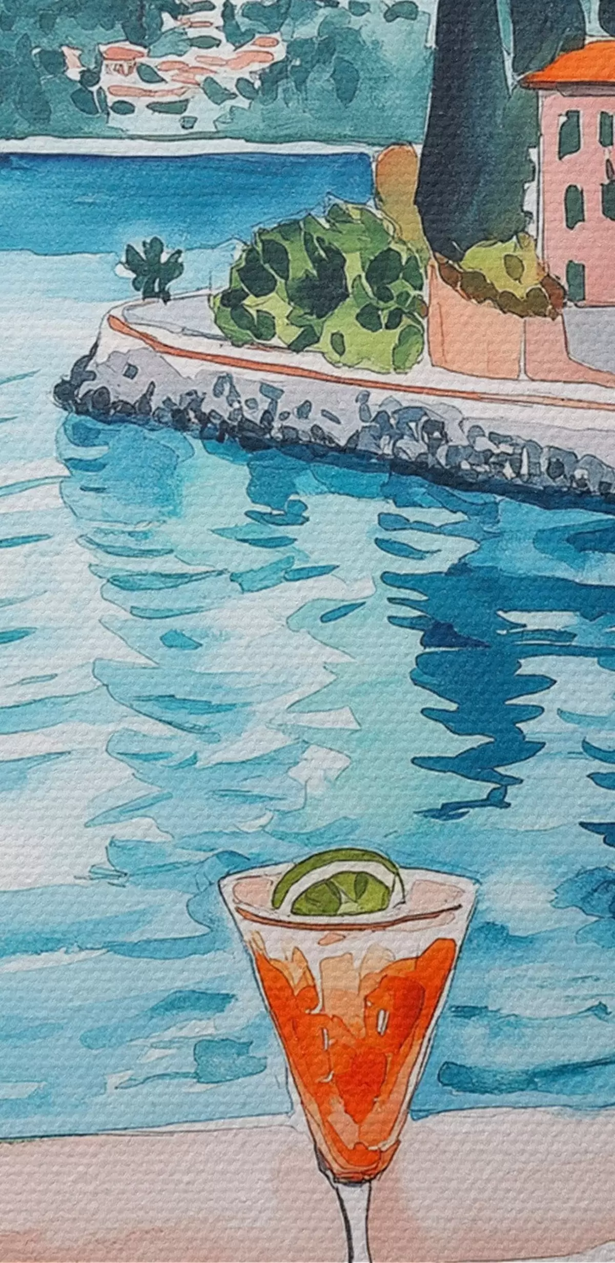 Picturi rotunde Lacul Como, Italia, stil acuarelă, pizza, cocktailuri, oraș vechi, munți Nr r42437