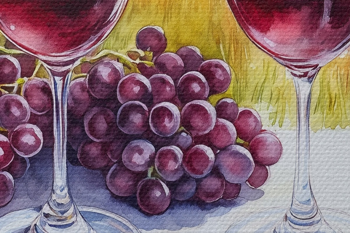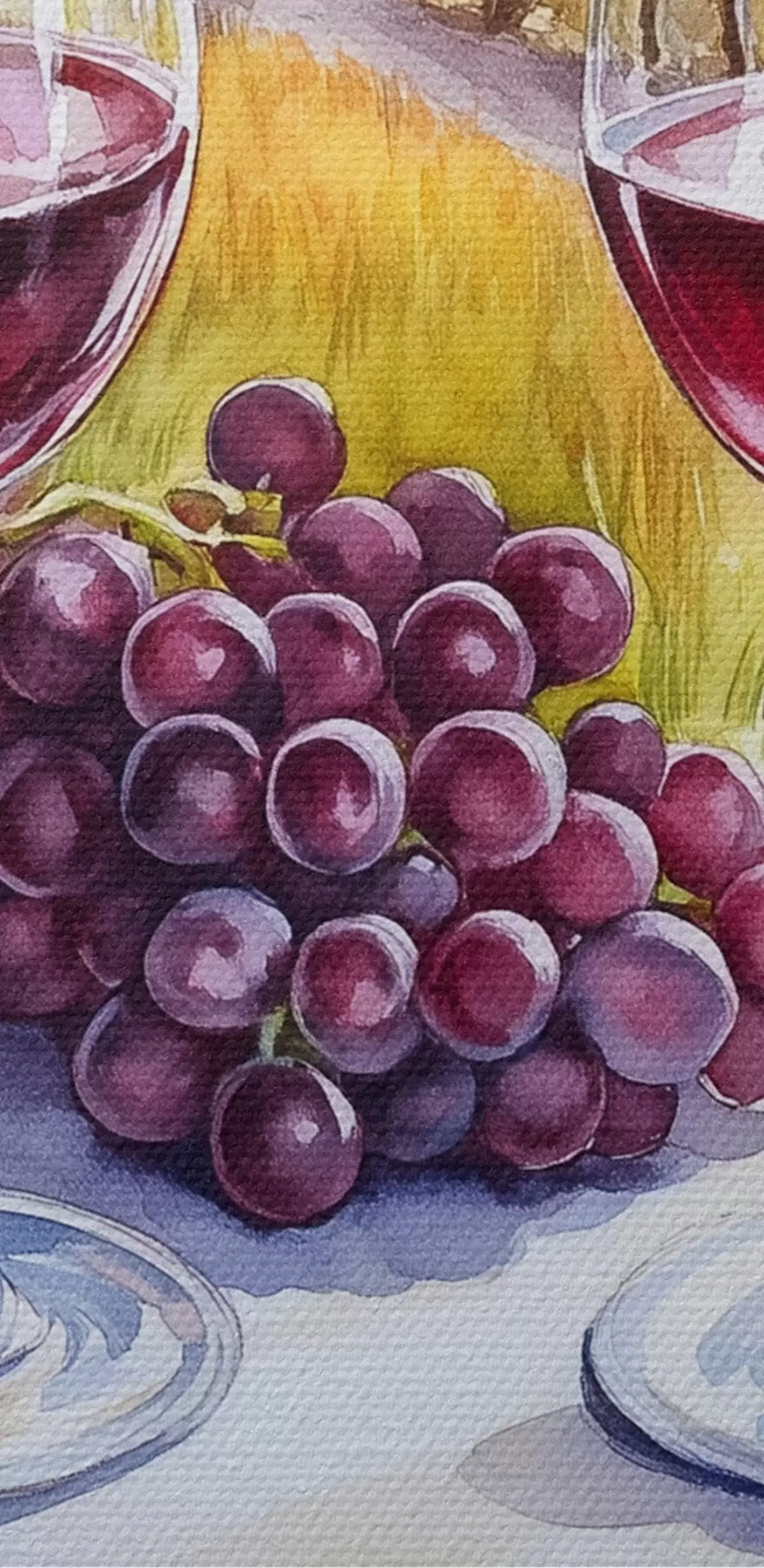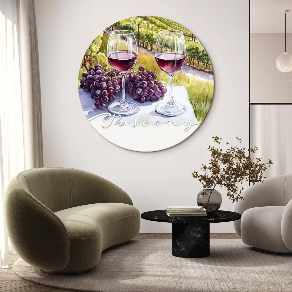 Picturi rotunde Toscana peisaje, stil acuarelă, pahare de vin, struguri, apus de soare r42439