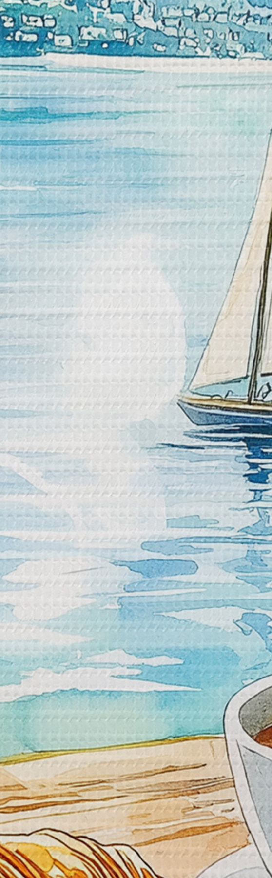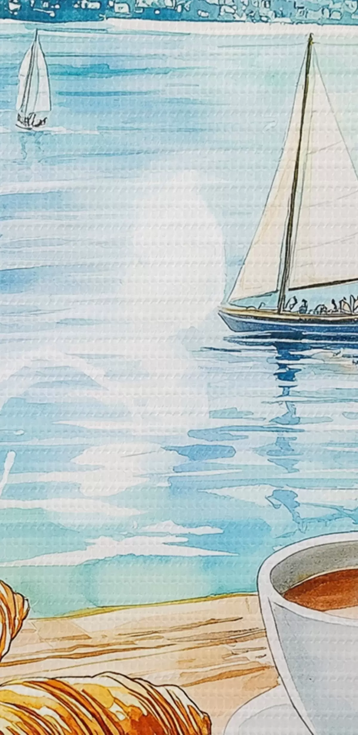 Picturi rotunde Lac de vară cu bărci cu pânze, cești de cafea, croissante, stil acuarelă Nr r42441