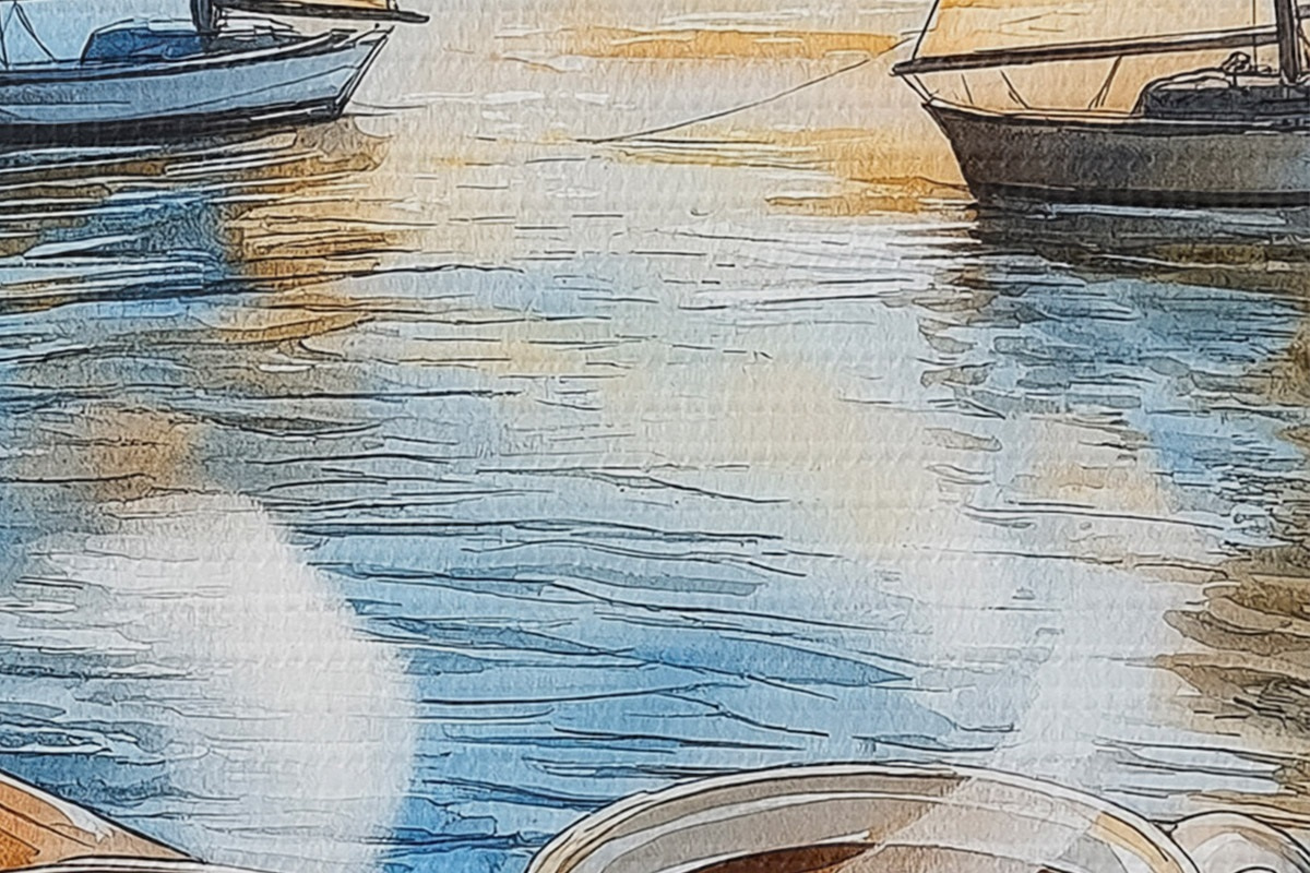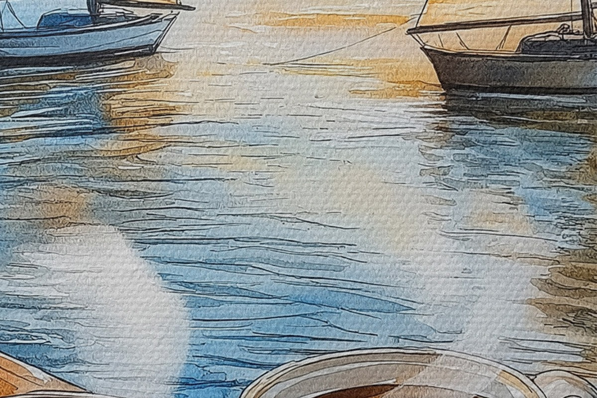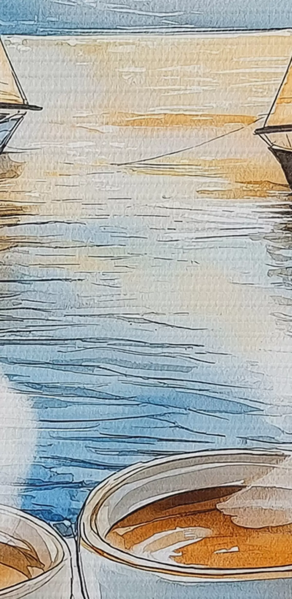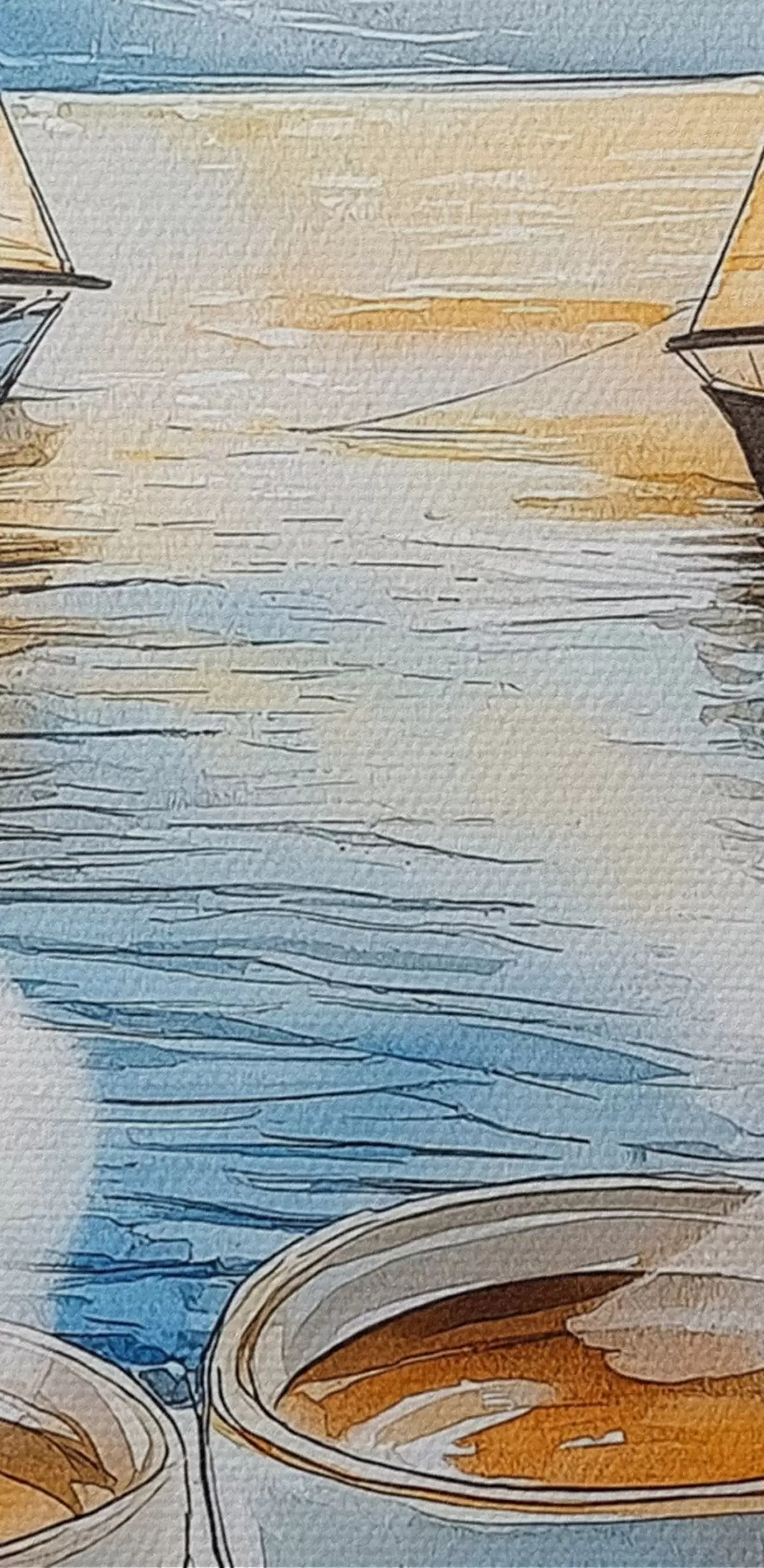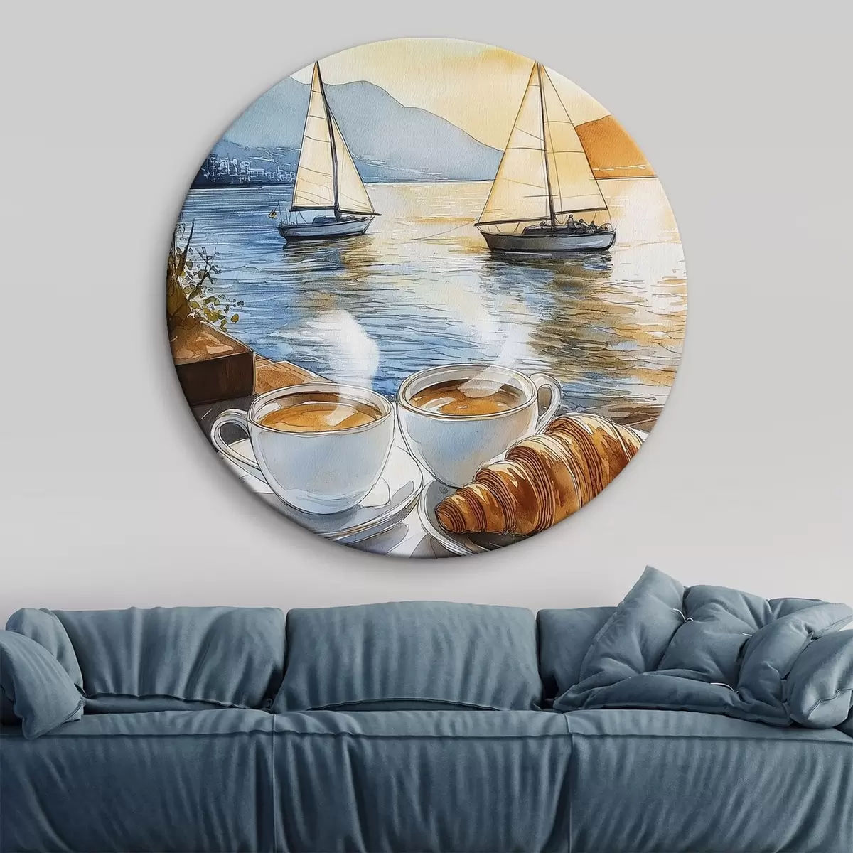 Picturi rotunde Apus de soare pe lac, bărci cu pânze, cești de cafea, stil acuarelă Nr r42442