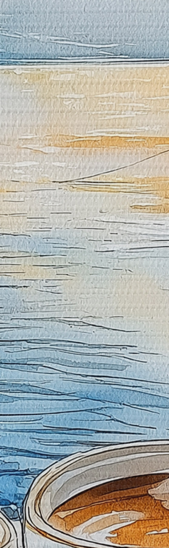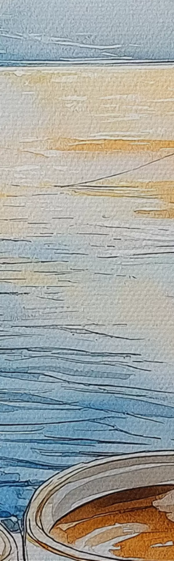 Picturi rotunde Apus de soare pe lac, bărci cu pânze, cești de cafea, stil acuarelă Nr r42442